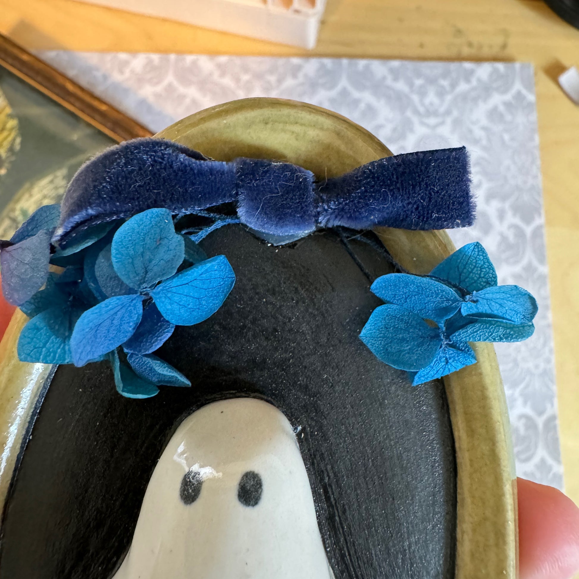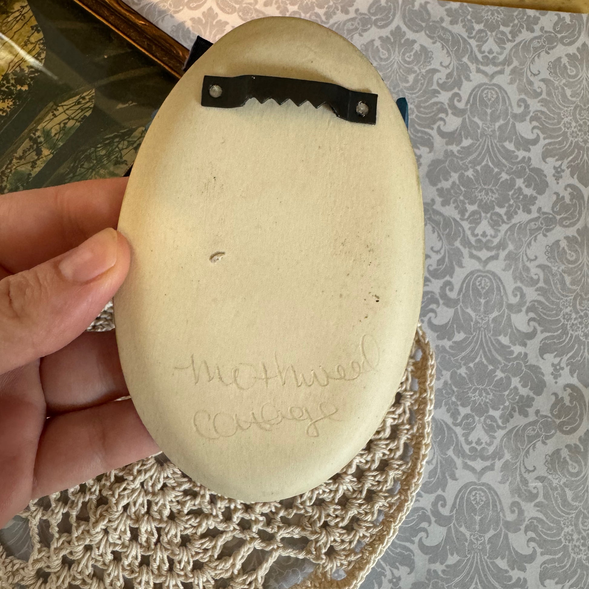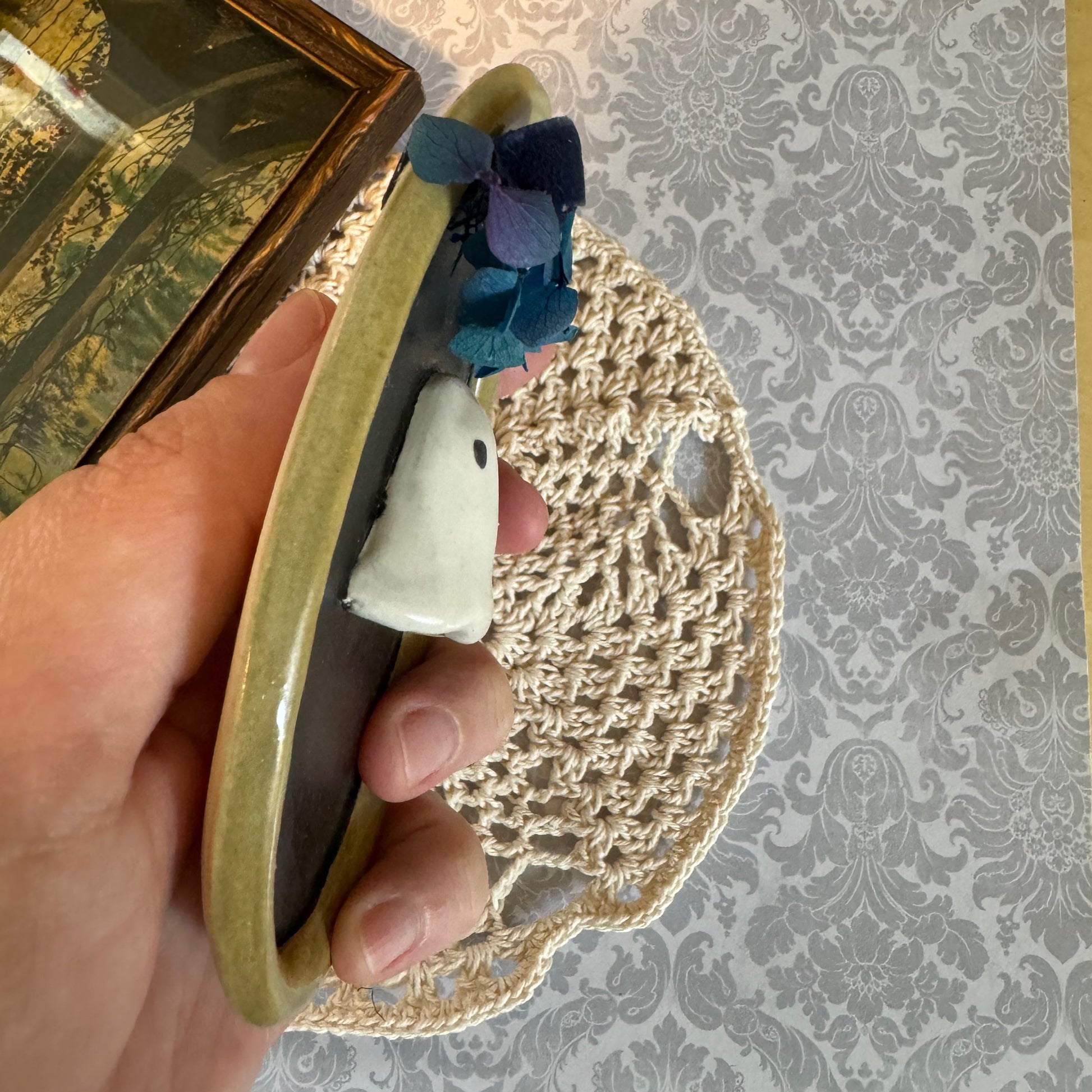 This handmade ceramic Cottage Garden Ghost Portrait is a whimsical portrayal of one of the many ghosts that haunt the Cottage Garden at Mothweed Cottage. Ready to hang in a special place of honor on your wall.Β
