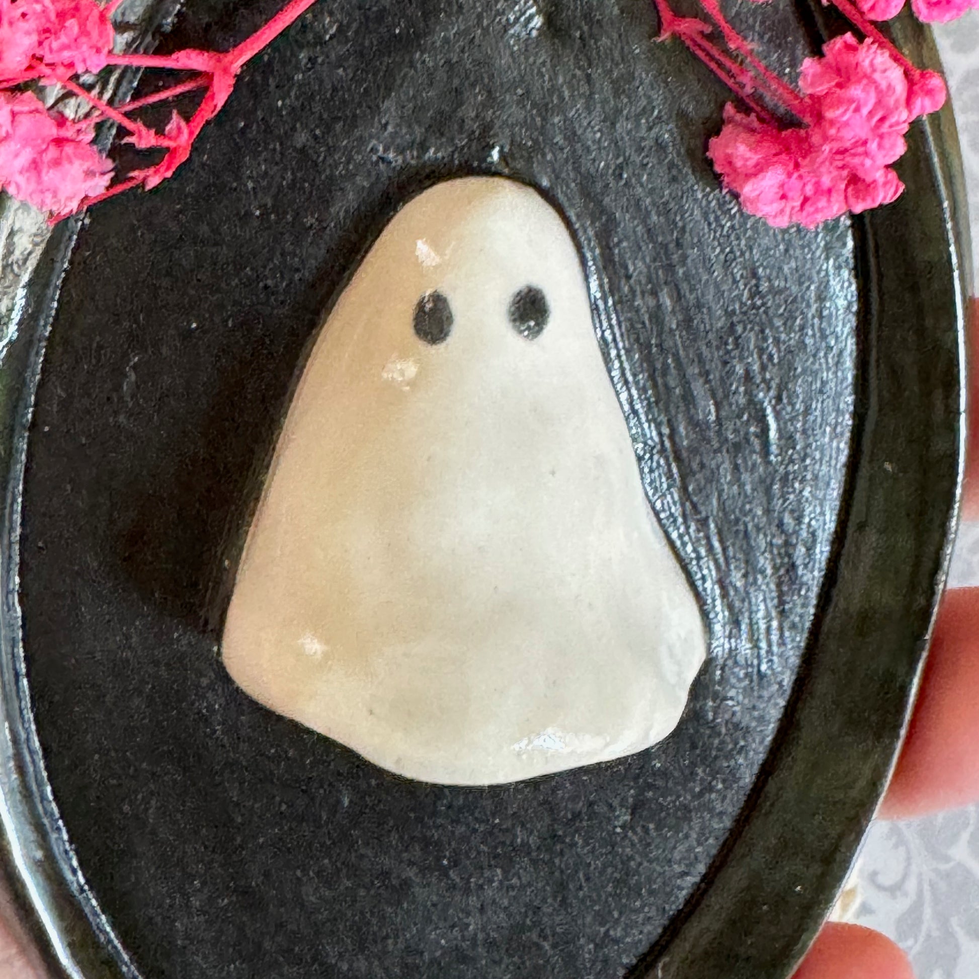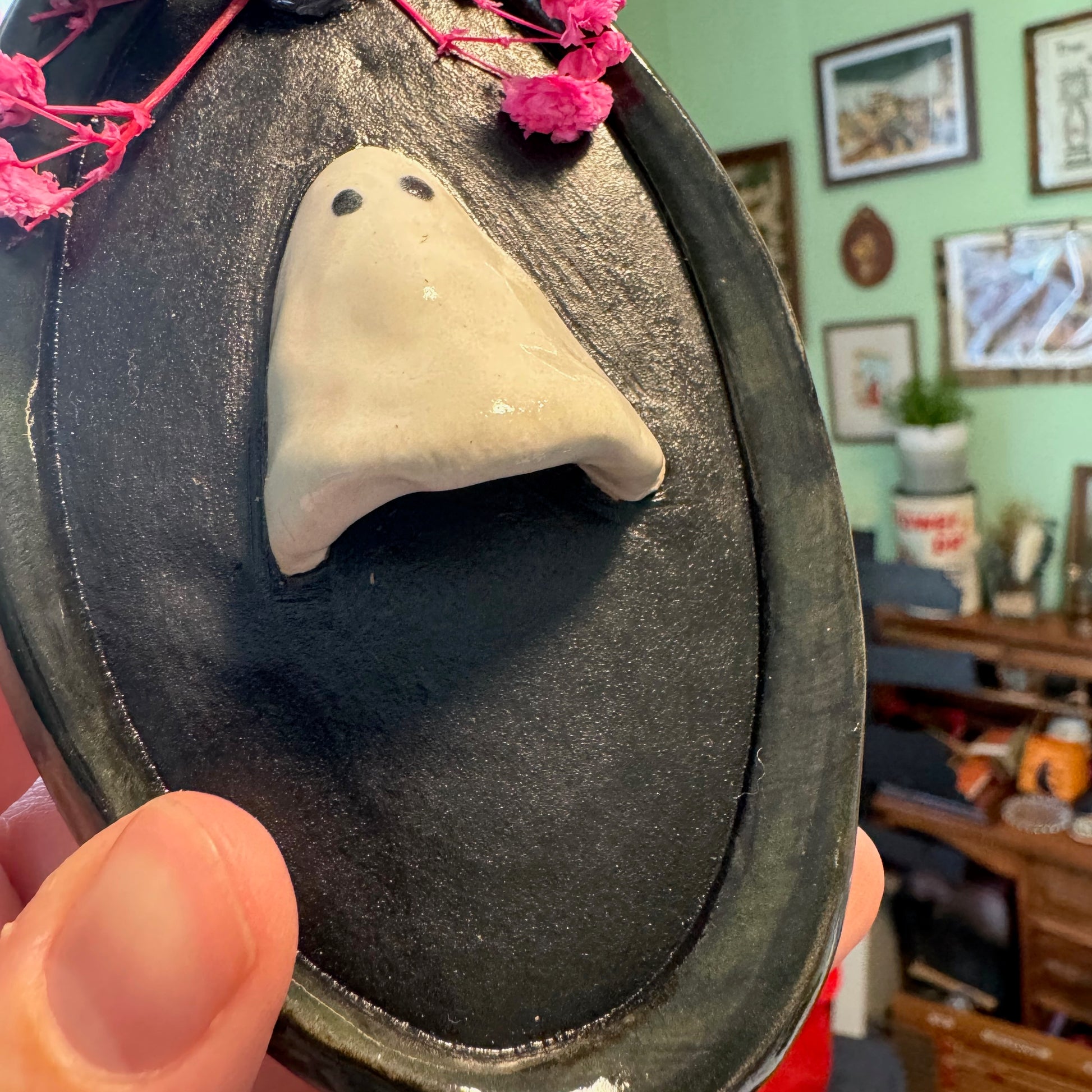 β¦ Glazed with a glossy black glaze with a subtle green tint around the frame and a glossy white on the ghost. The portrait background is a matte black. Back of ornament is unglazed and shows the natural ceramic clay.Β