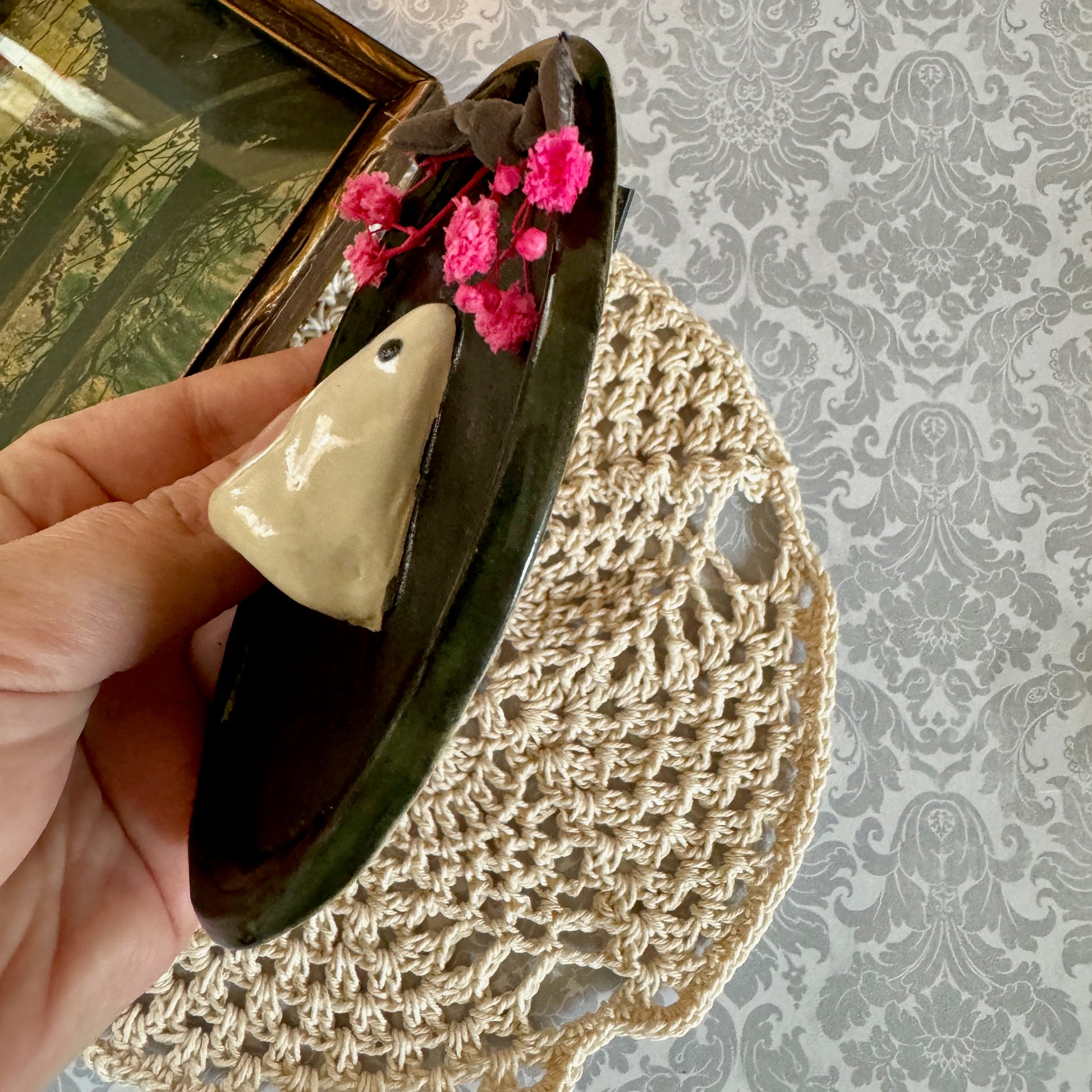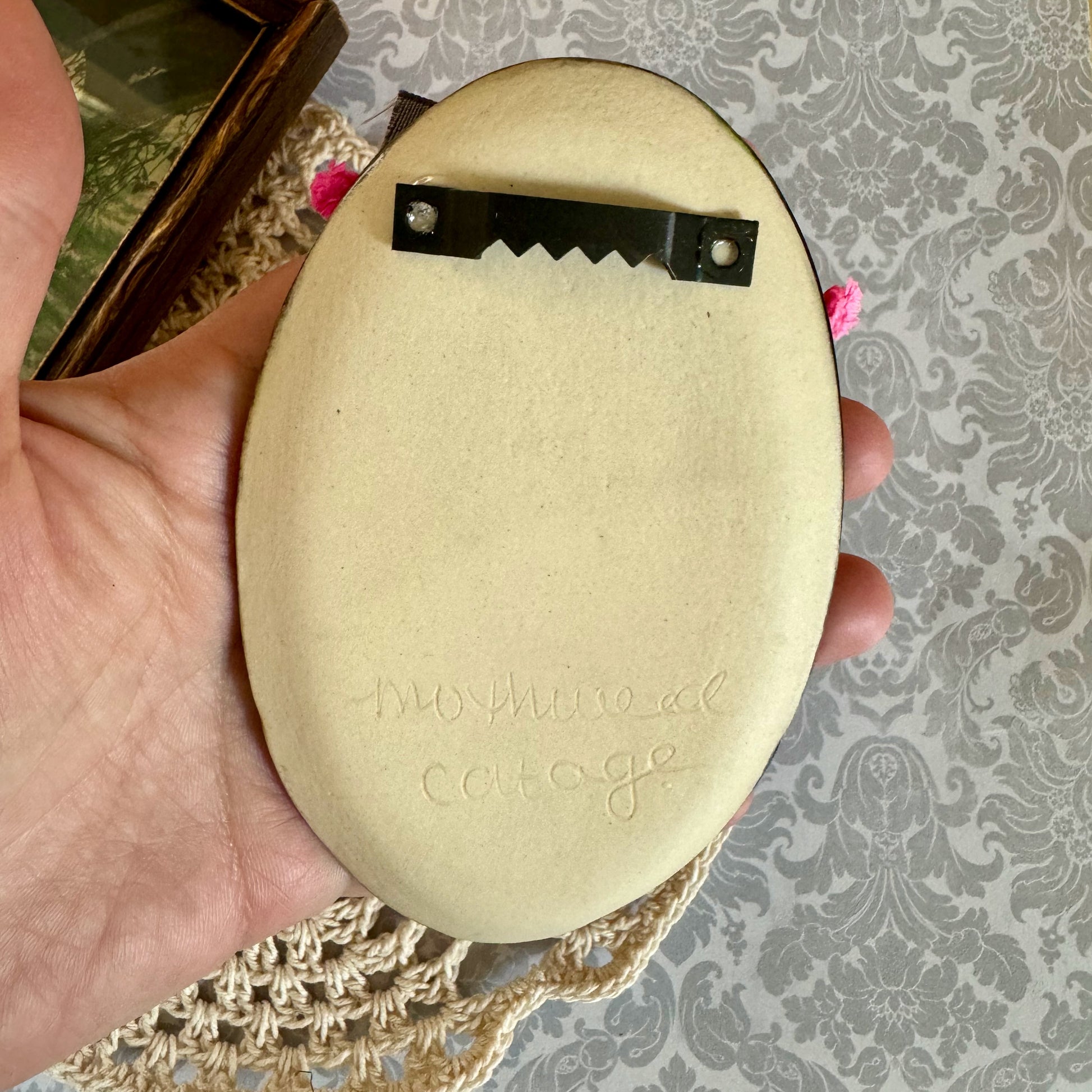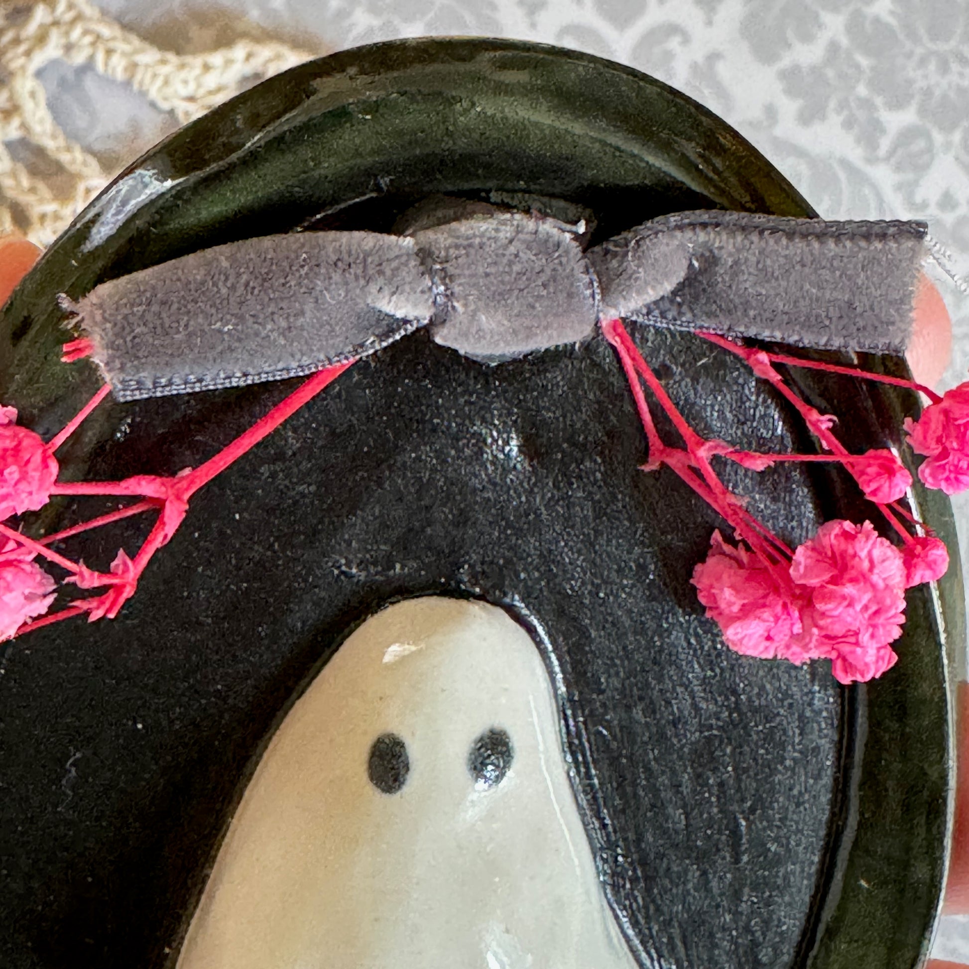 This handmade ceramic Cottage Garden Ghost Portrait is a whimsical portrayal of one of the many ghosts that haunt the Cottage Garden at Mothweed Cottage. Ready to hang in a special place of honor on your wall.Β