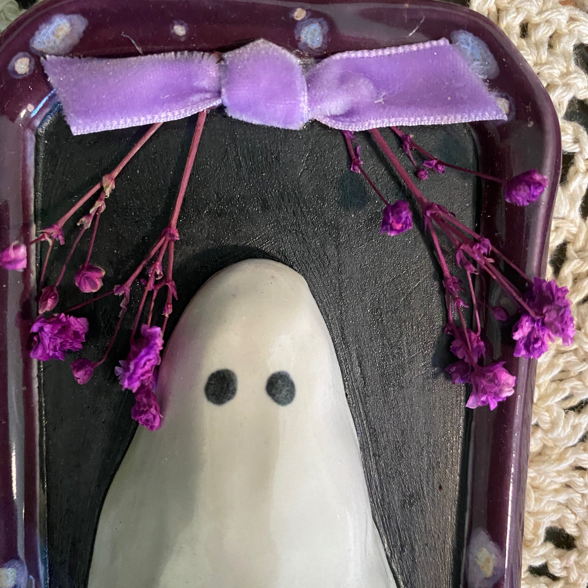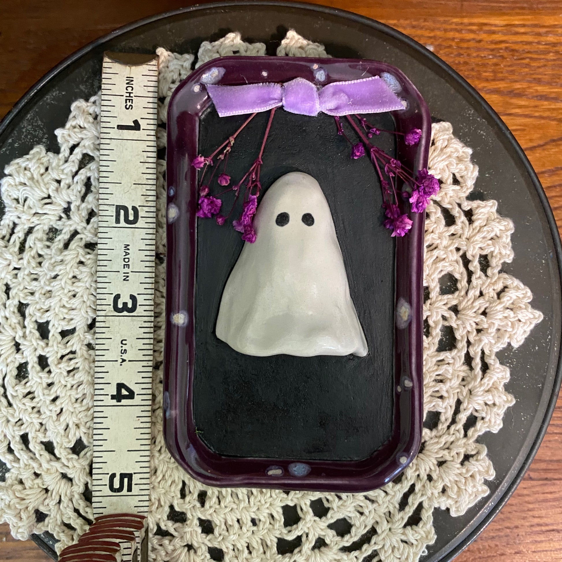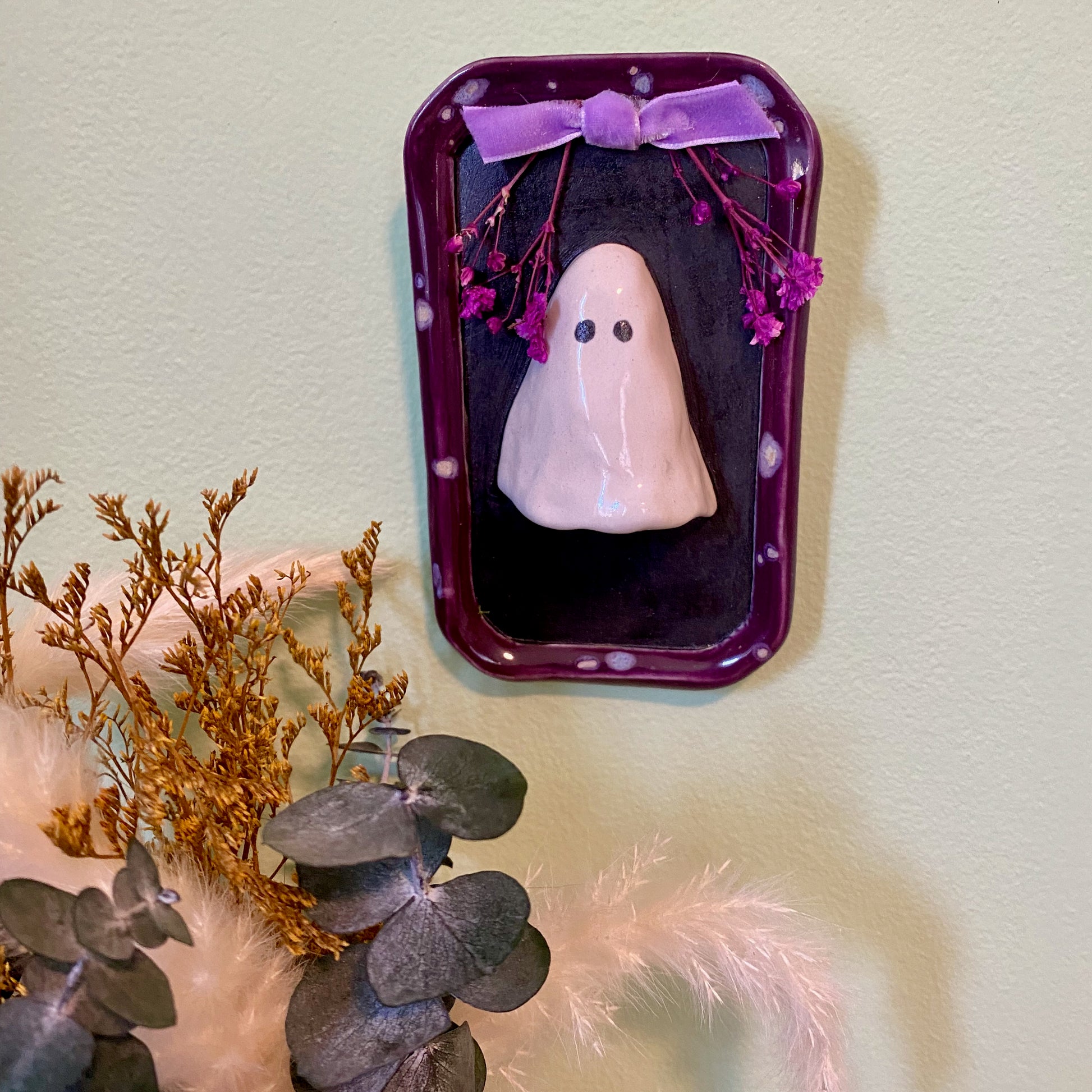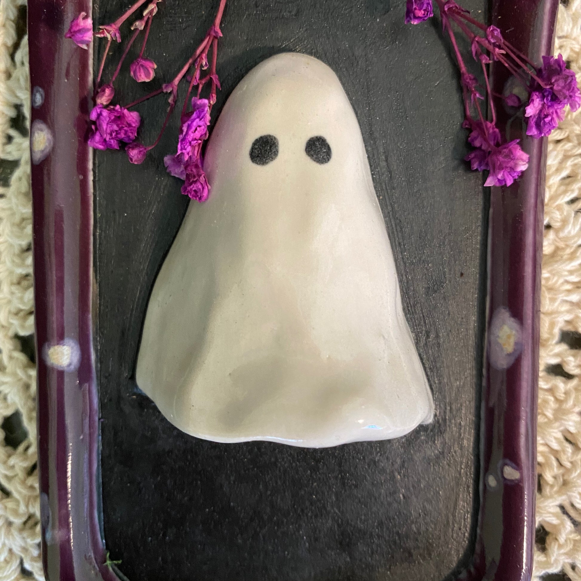 β¦ Glazed with a speckled purple glaze with "crystal blooms"Β around the frame and a glossy white on the ghost. The portrait background is a matte black. Back of ornament is unglazed and shows the natural ceramic clay.