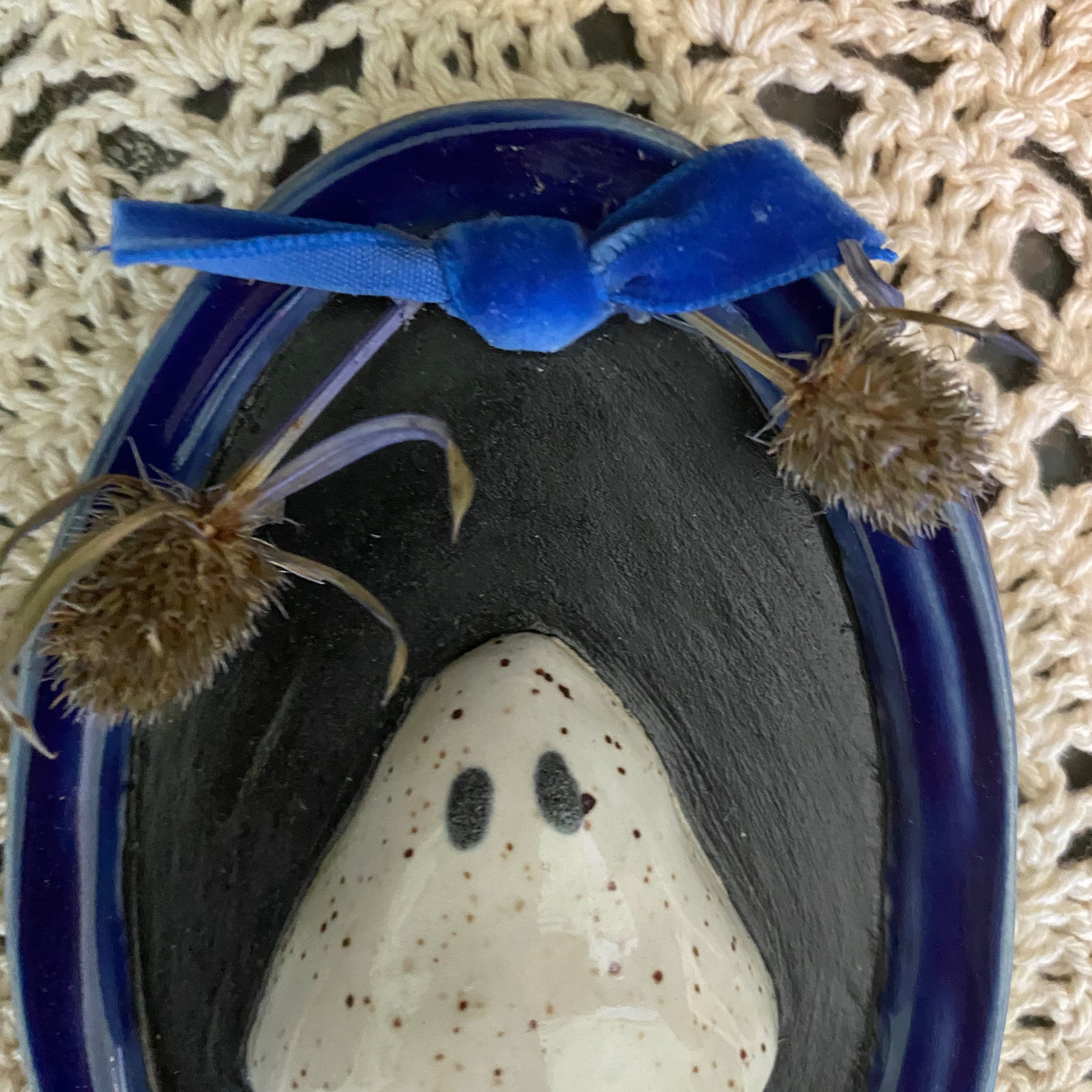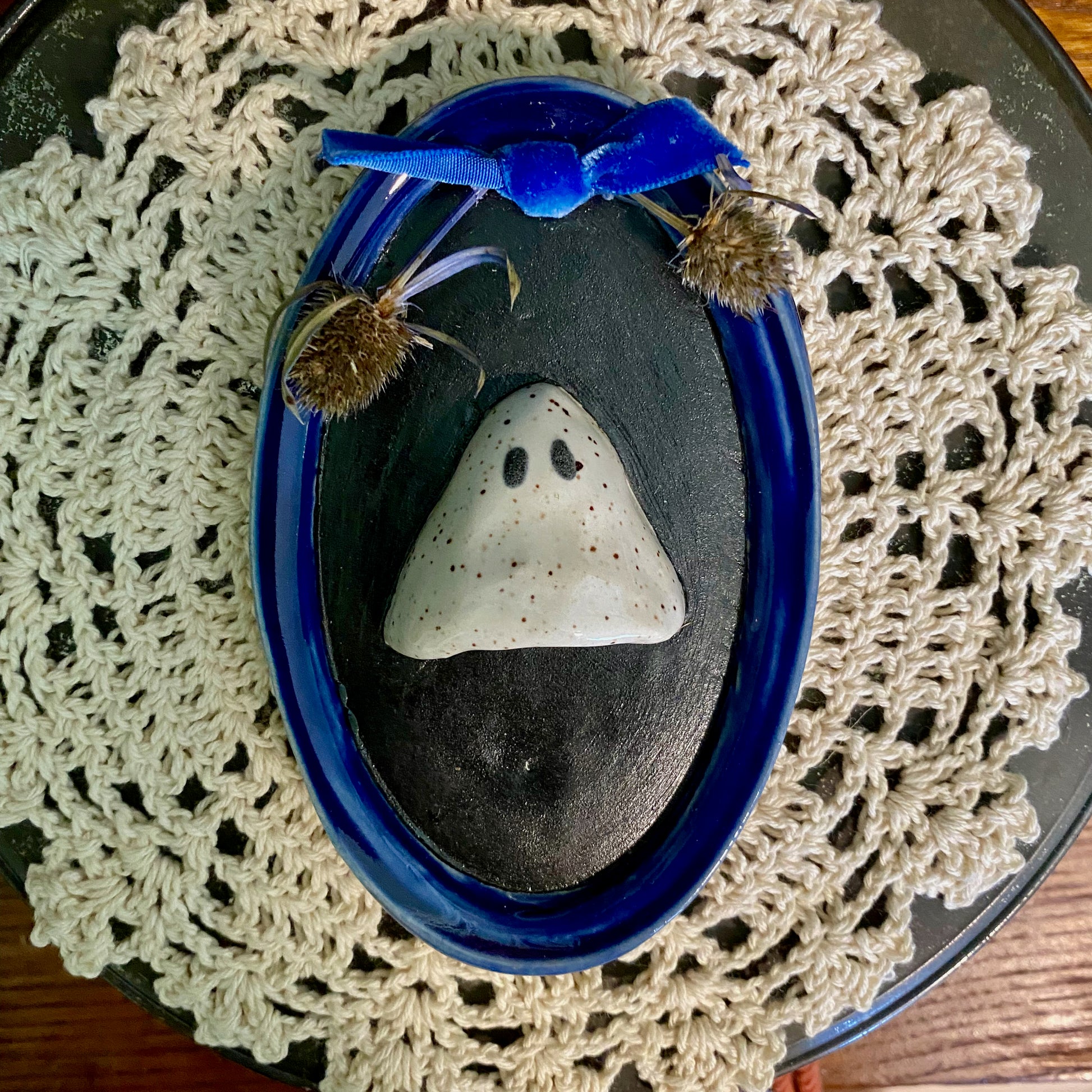 This handmade ceramic Cottage Garden Ghost Portrait is a whimsical portrayal of one of the many ghosts that haunt the Cottage Garden at Mothweed Cottage. Ready to hang in a special place of honor on your wall.Β
