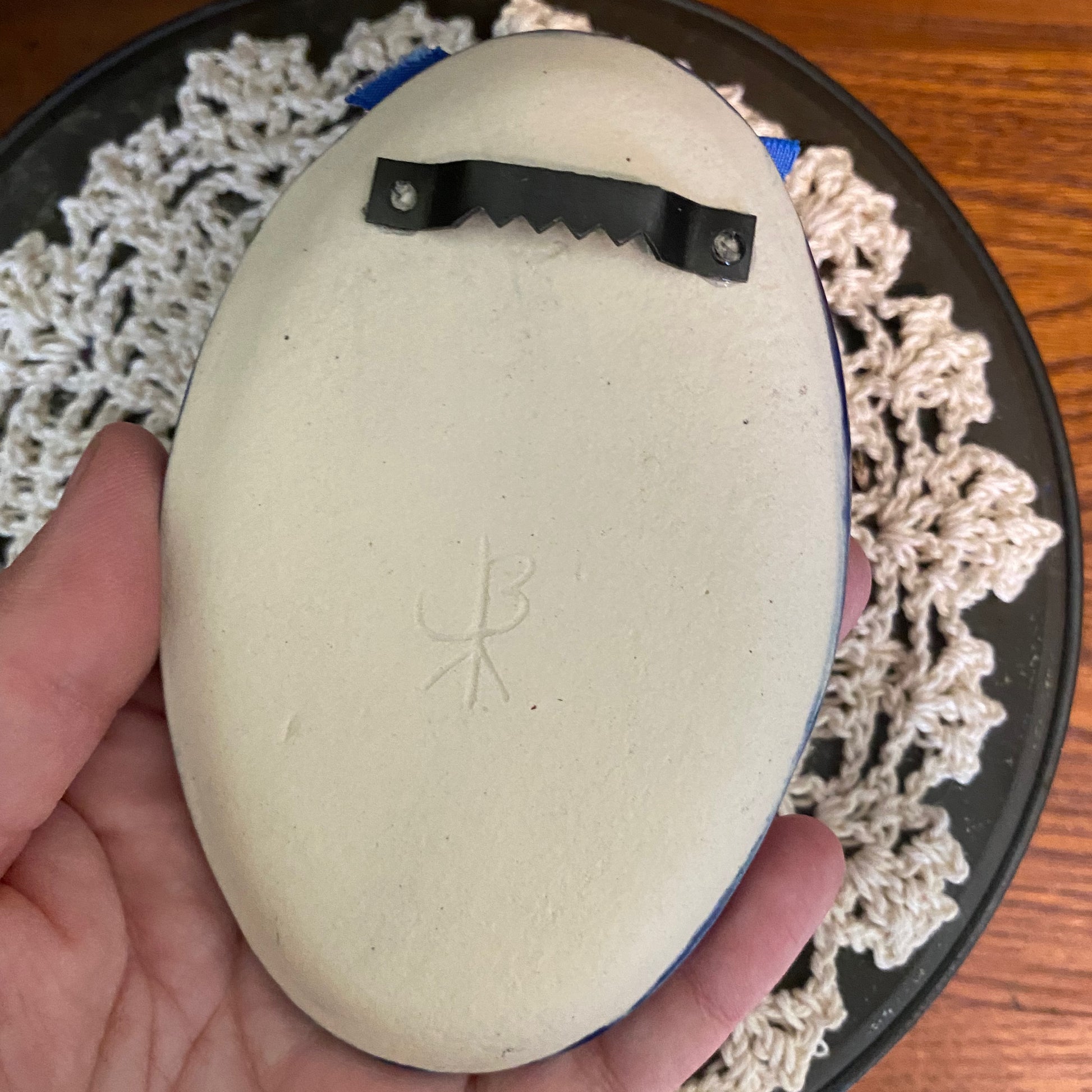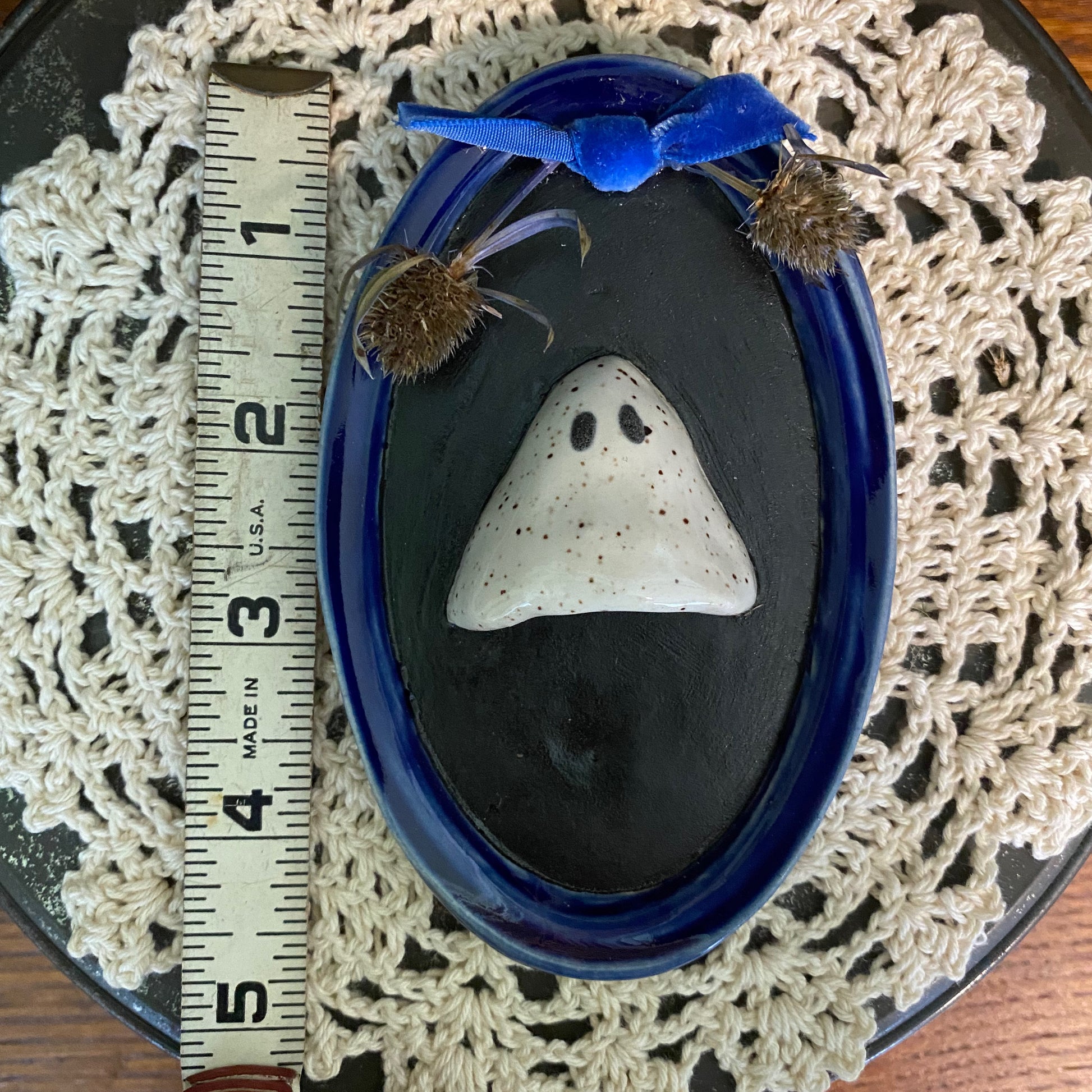 β¦ Glazed with a glossy blue glaze around the frame and a glossy white on the ghost. The portrait background is a matte black. Back of ornament is unglazed and shows the natural ceramic clay. Ghost is made from speckled clay and speckles show through the glaze.