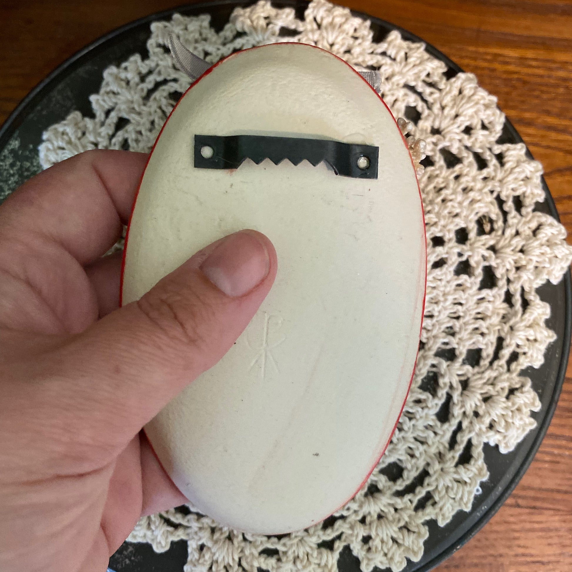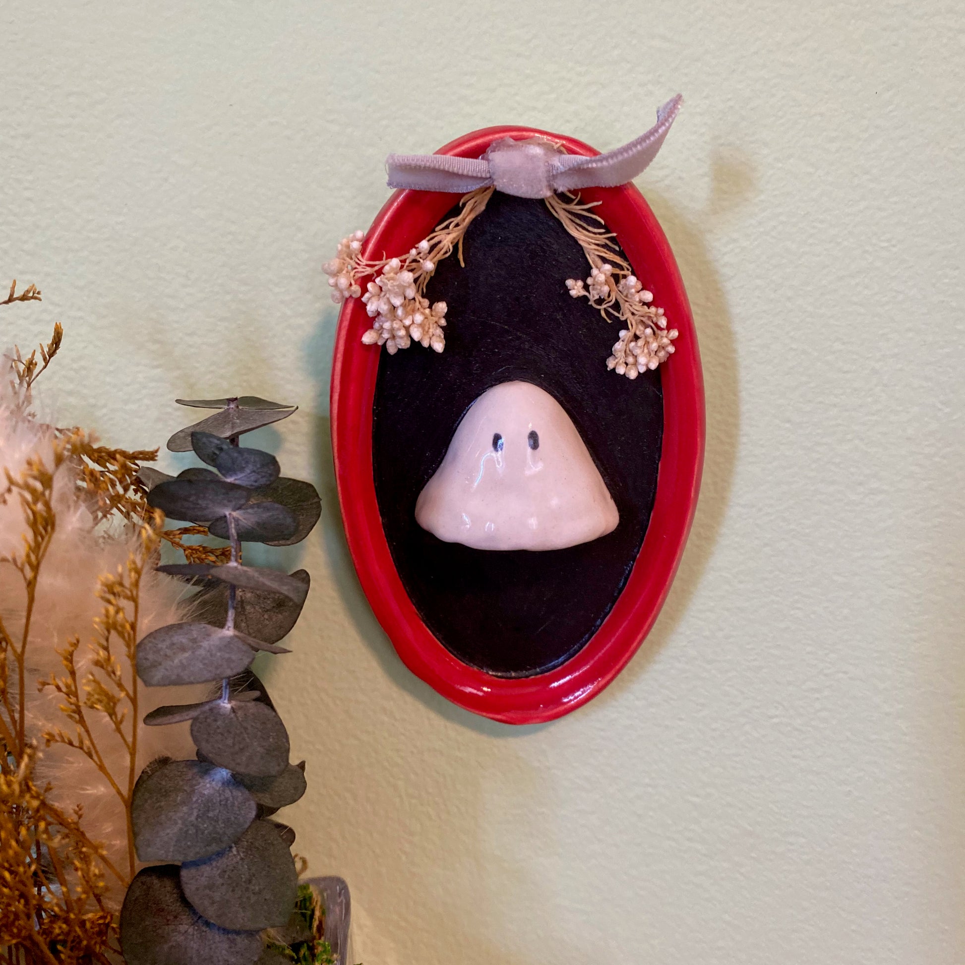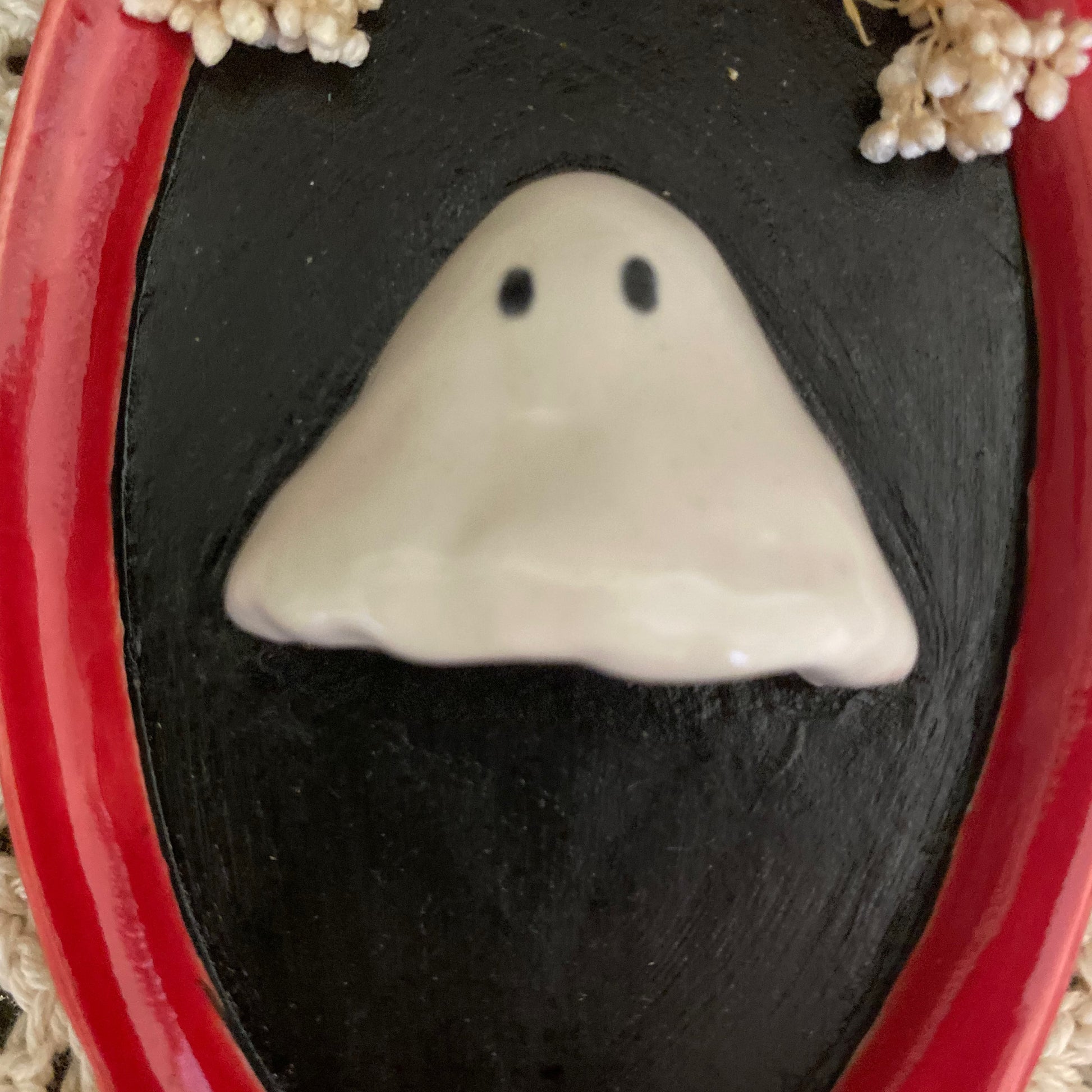 β¦ Glazed with a glossy redΒ glaze around the frame and a glossy white on the ghost. The portrait background is a matte black. Back of ornament is unglazed and shows the natural ceramic clay.