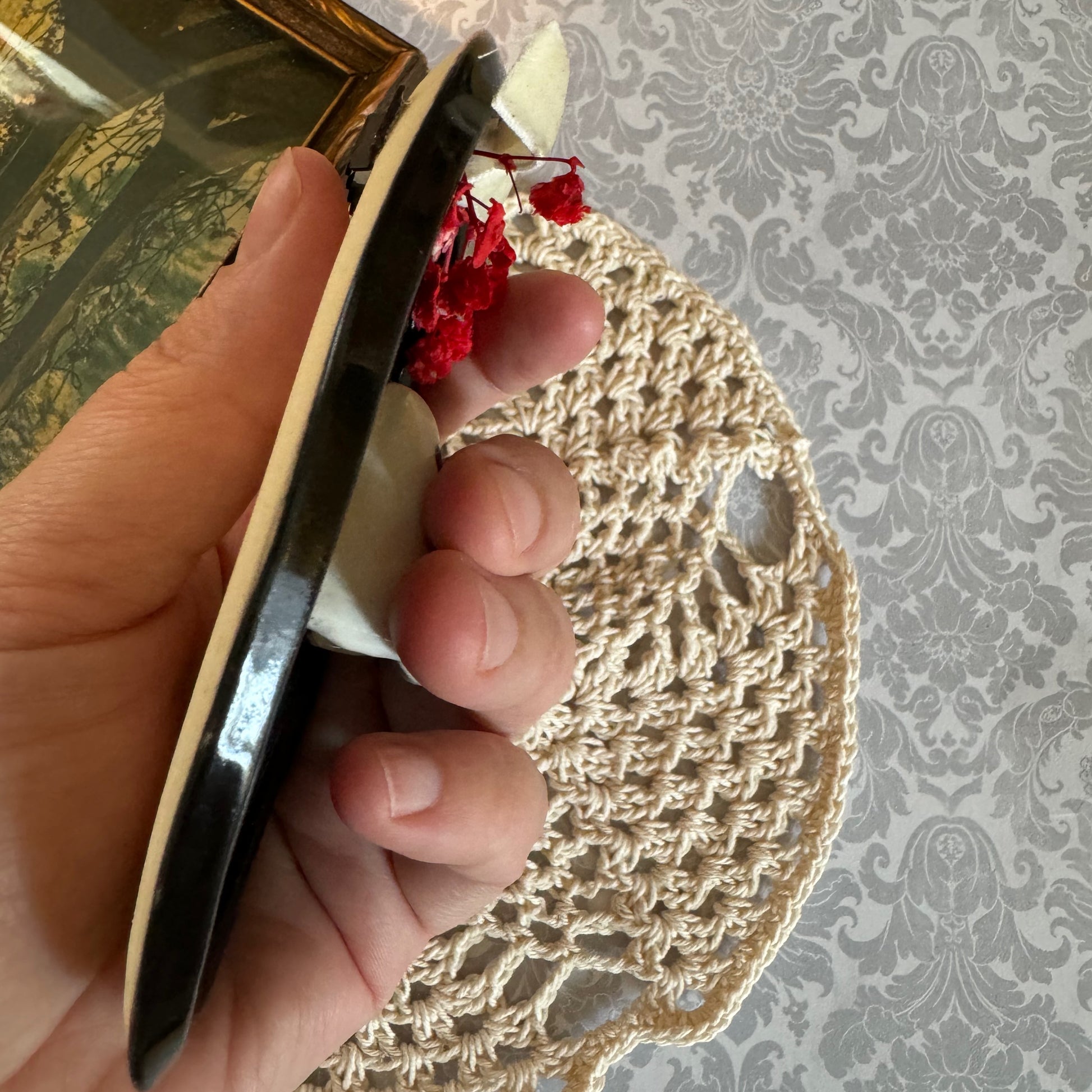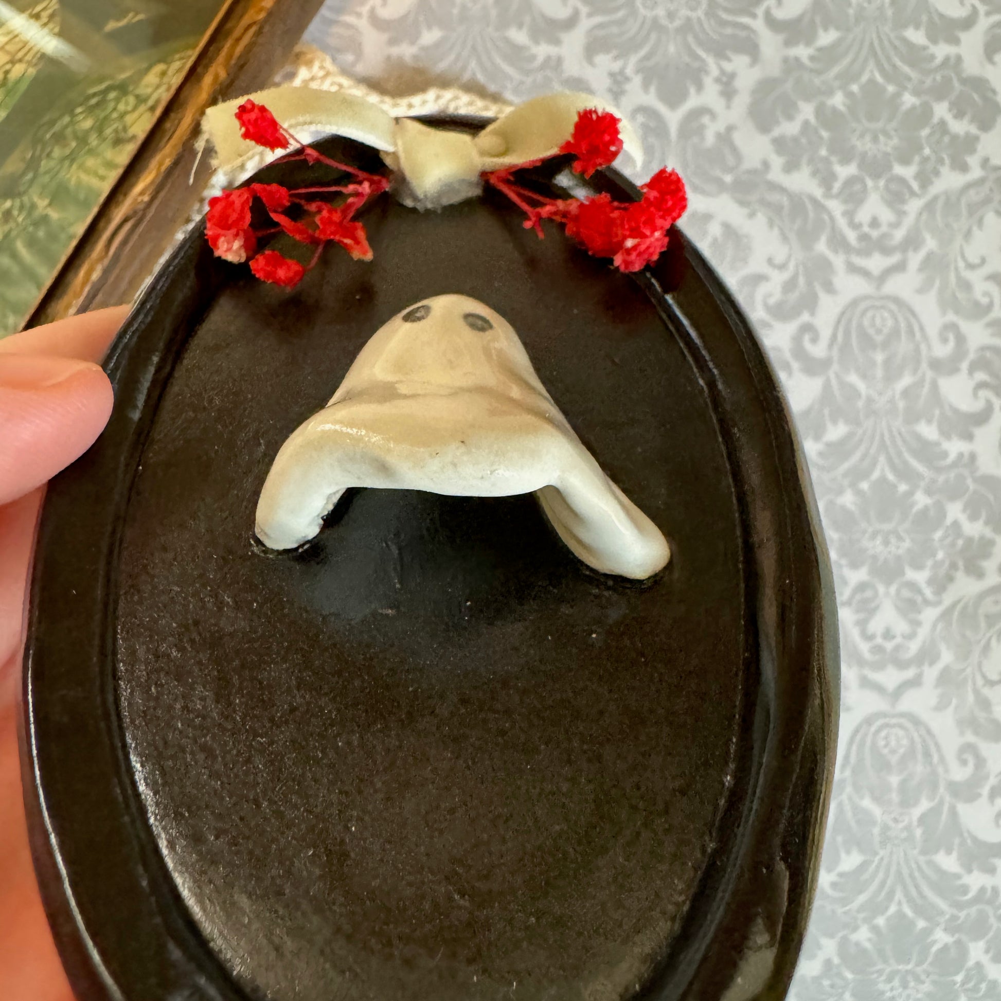 β¦ Glazed with a glossy black glaze with around the frame and a glossy white on the ghost. The portrait background is a matte black. Back of ornament is unglazed and shows the natural ceramic clay.Β