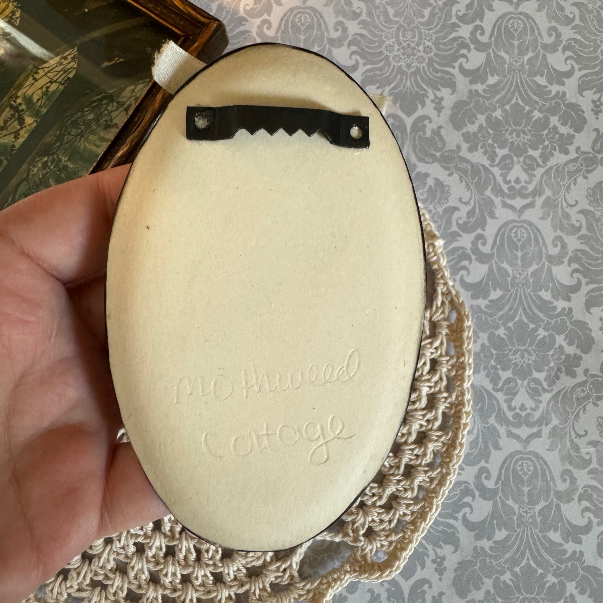 This handmade ceramic Cottage Garden Ghost Portrait is a whimsical portrayal of one of the many ghosts that haunt the Cottage Garden at Mothweed Cottage. Ready to hang in a special place of honor on your wall.Β