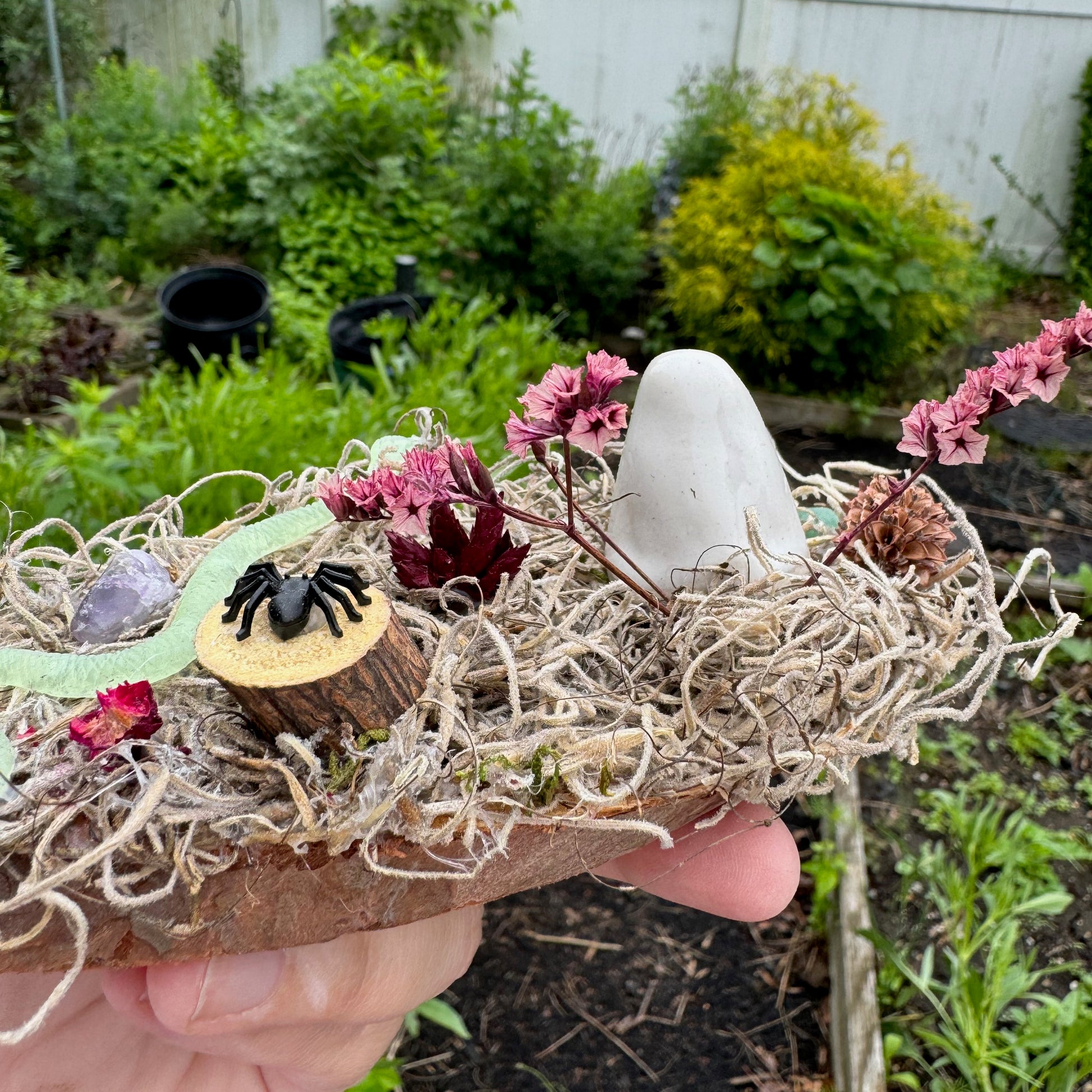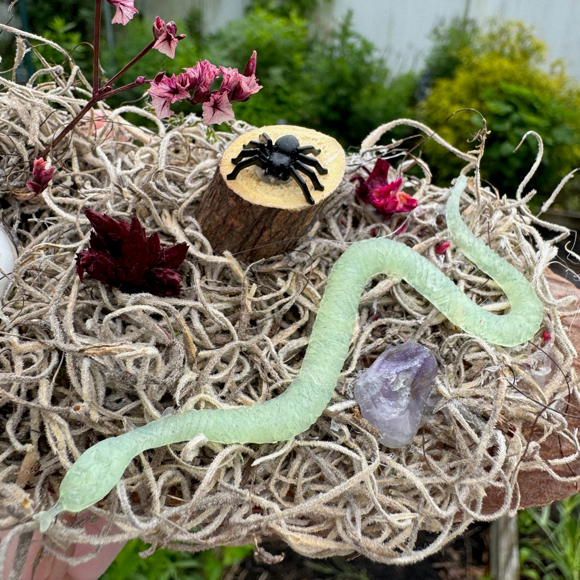 This exclusive, handcrafted Creepy Forest Ghost Garden features a mini ceramic ghost, preserved moss, dried flowers, crystals, fake spider and glow in the dark snake on a wood slice base. Approximately 6" long.