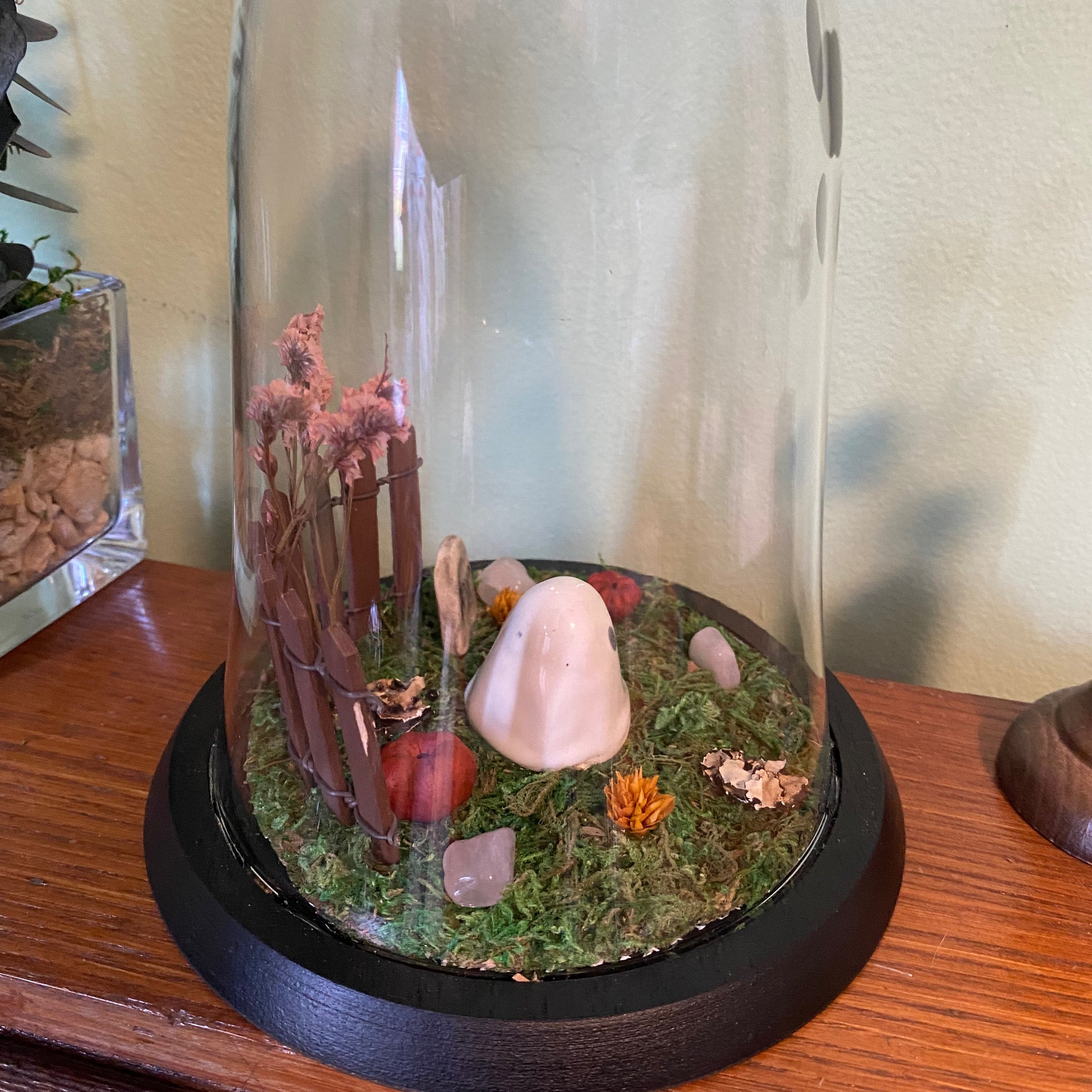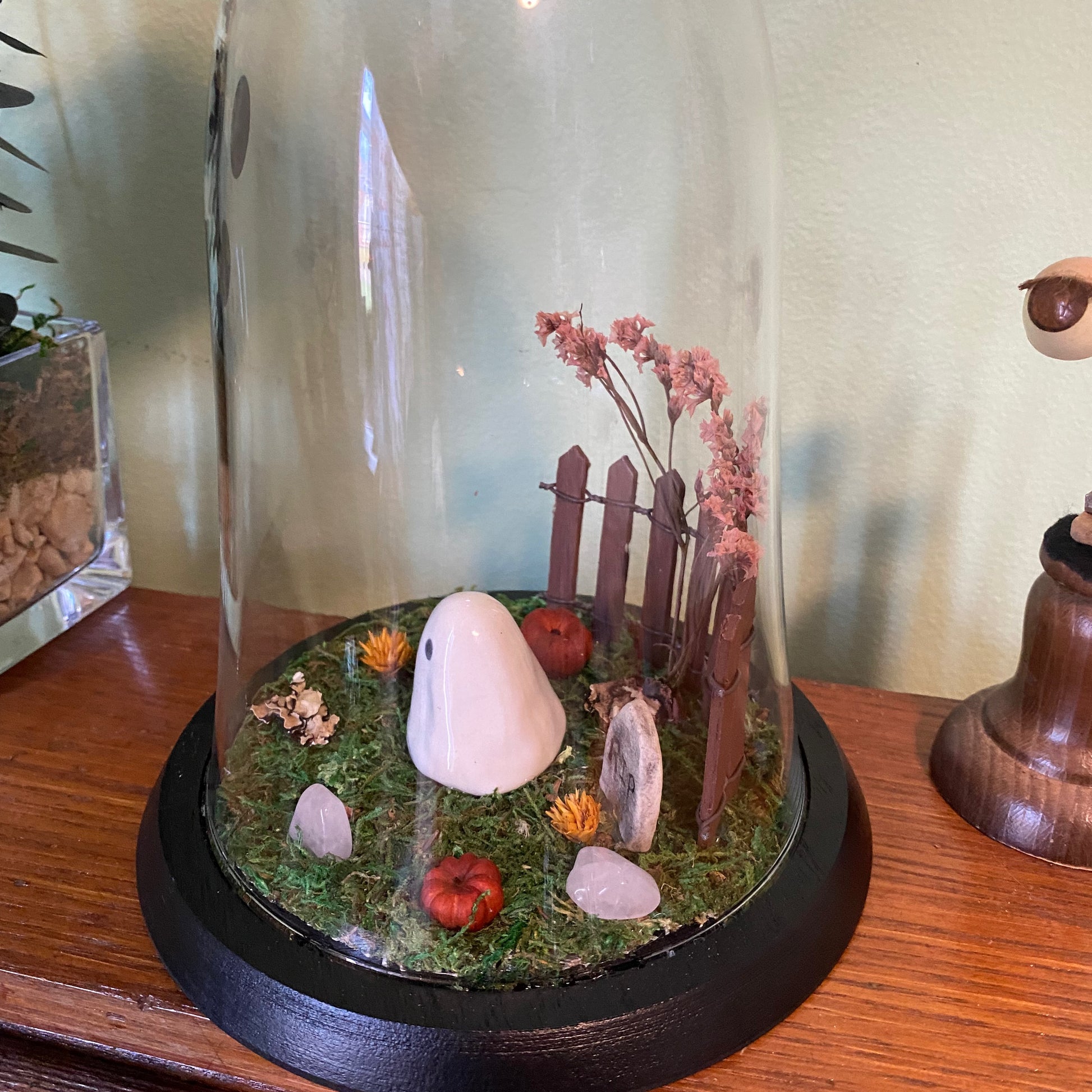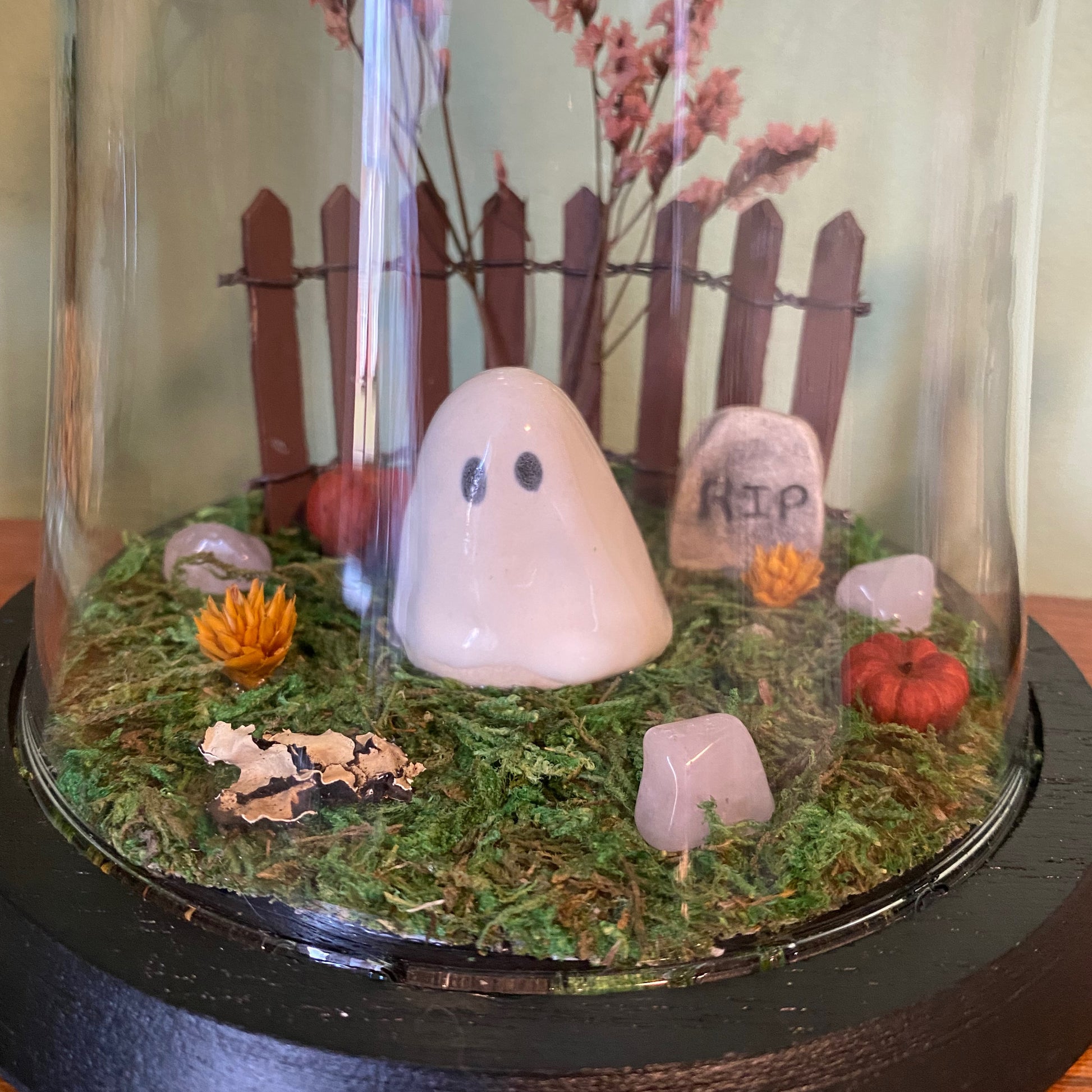 A handmade ceramic ghost nestled in its own little autumnal cemeteryΒ complete with preserved mosses, dried flowers and crystals inside aΒ glass, ghost shaped cloche. Cloche has a black wooden base.