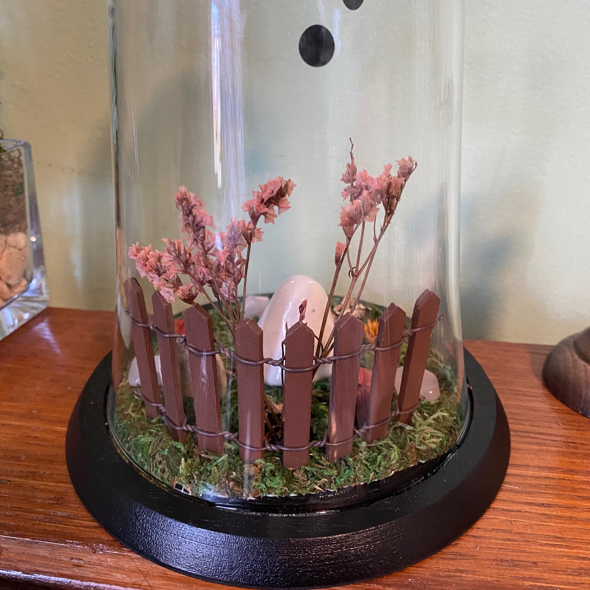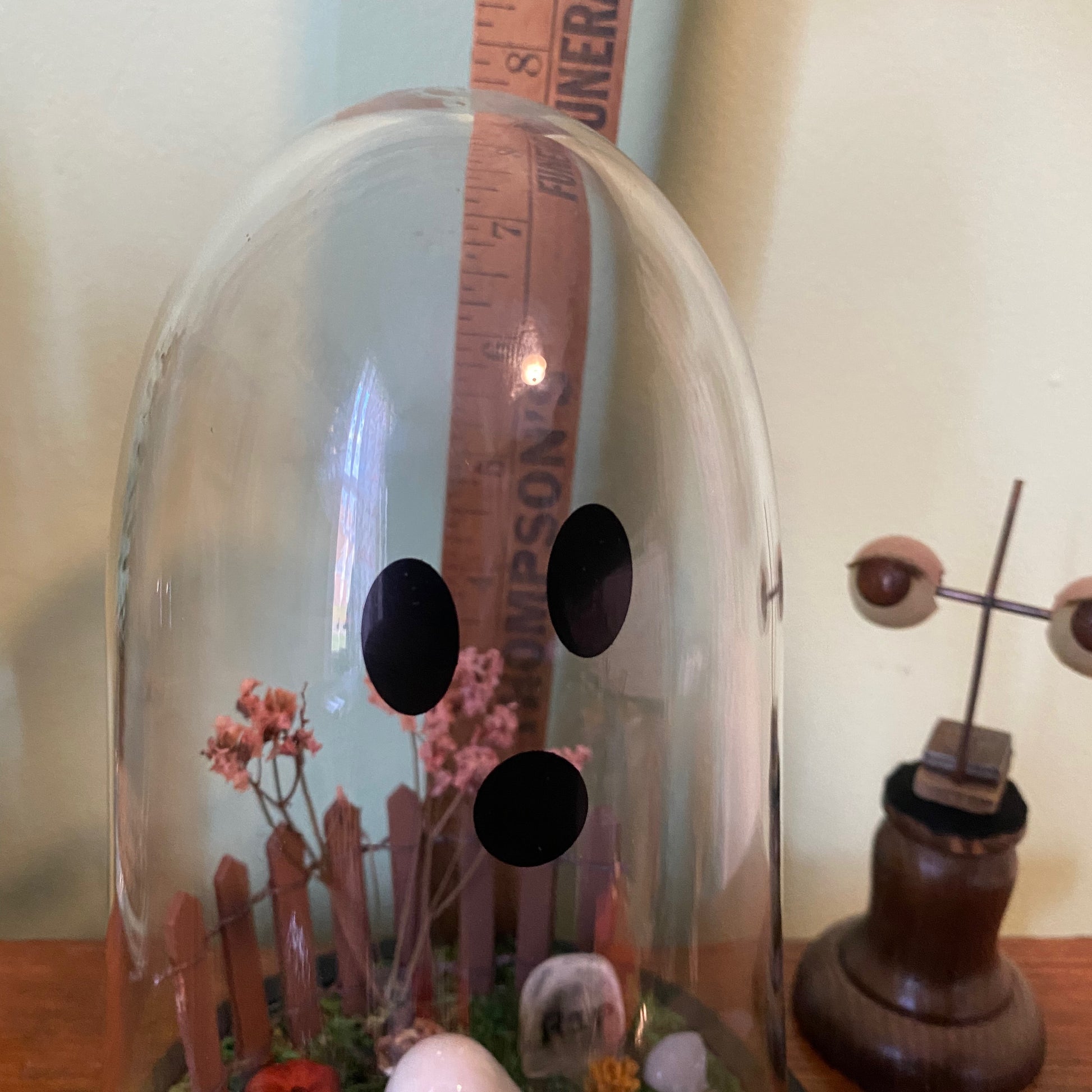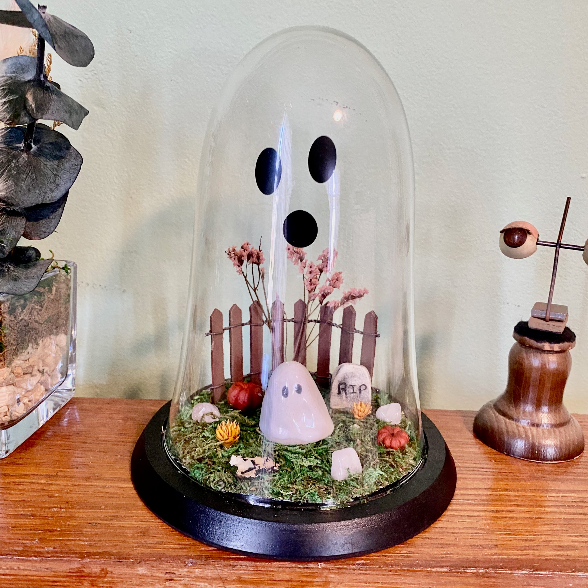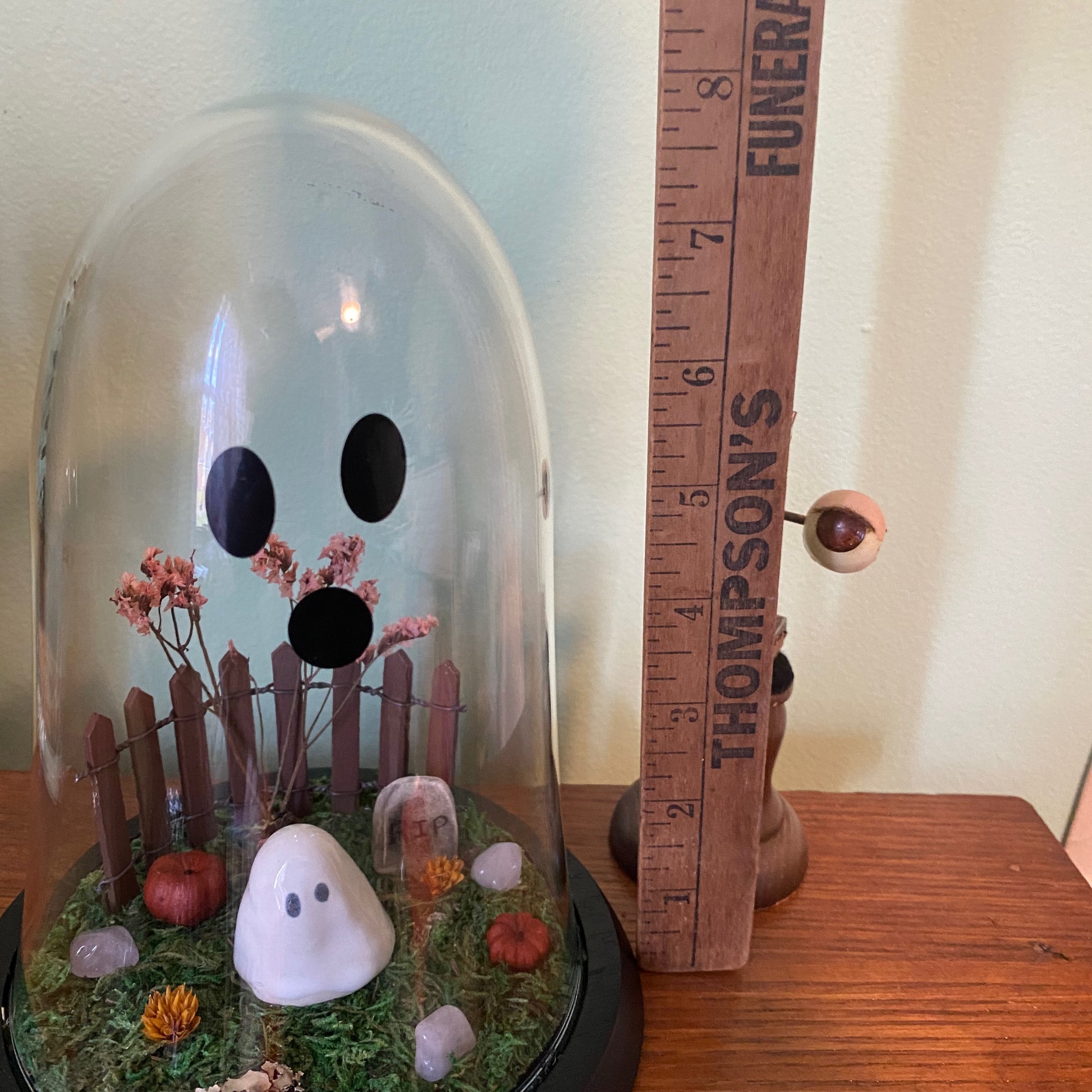 A handmade ceramic ghost nestled in its own little autumnal cemeteryΒ complete with preserved mosses, dried flowers and crystals inside aΒ glass, ghost shaped cloche. Cloche has a black wooden base.