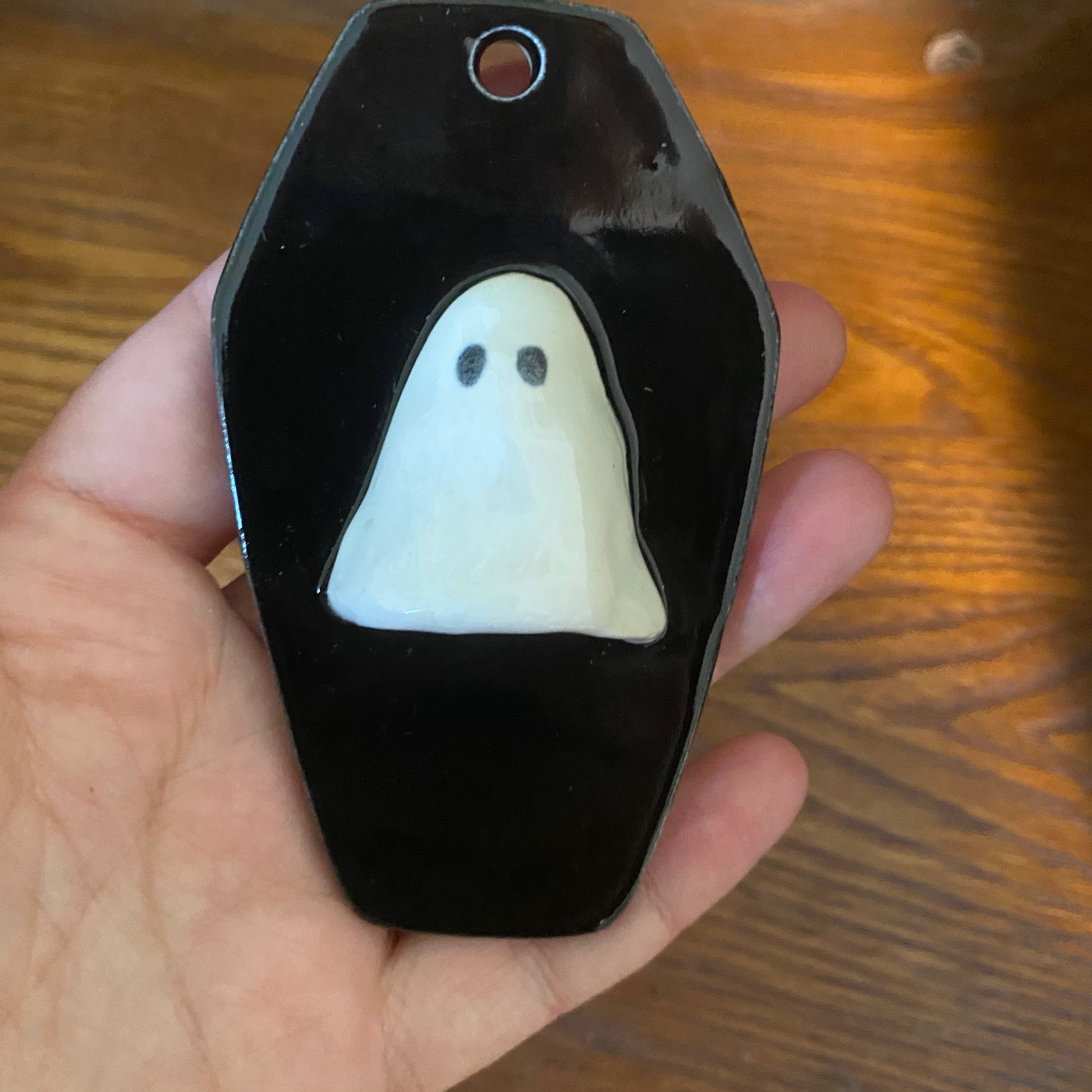 โฆ One handmadeย ceramic ghost coffin ornament.