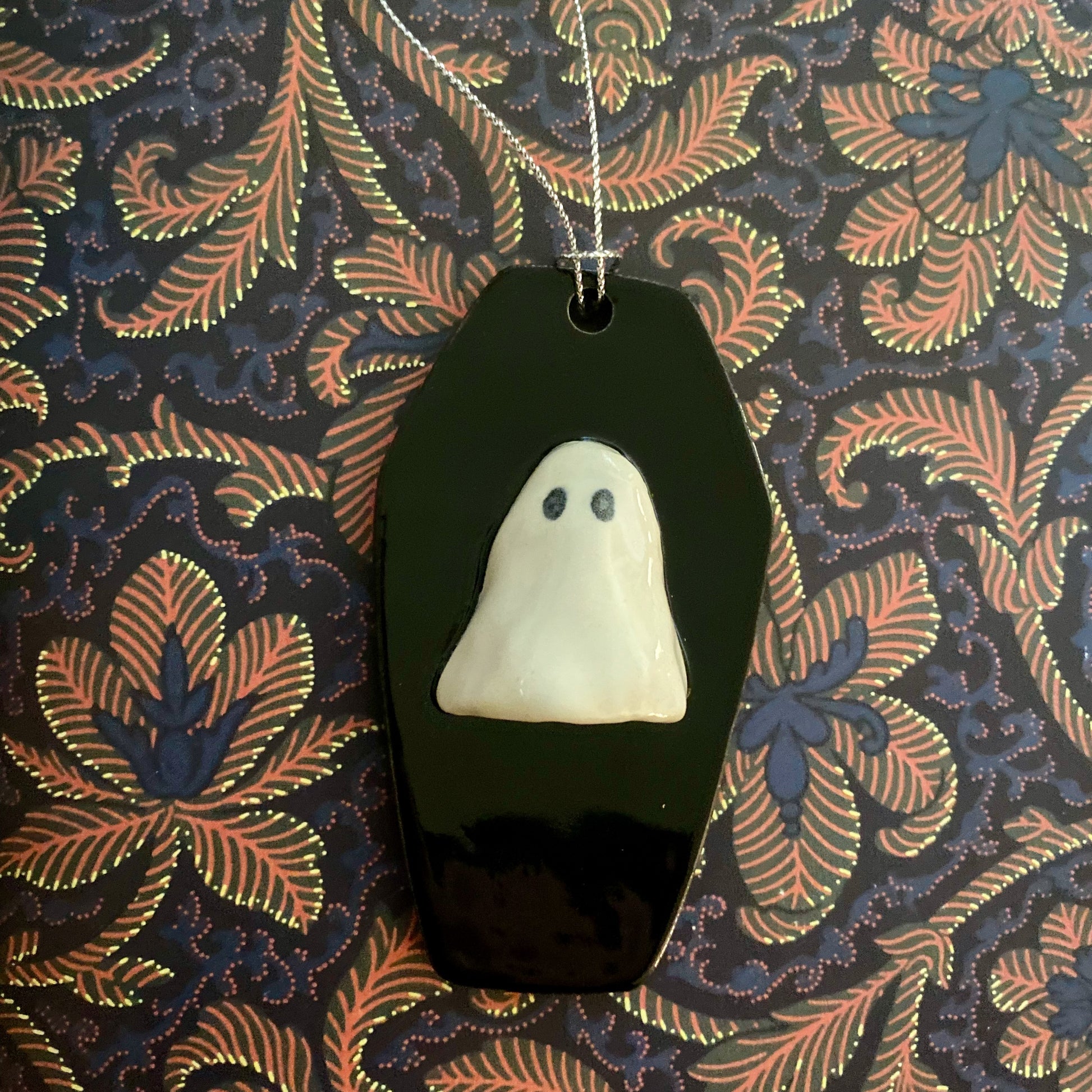 โฆ One handmadeย ceramic ghost coffin ornament.