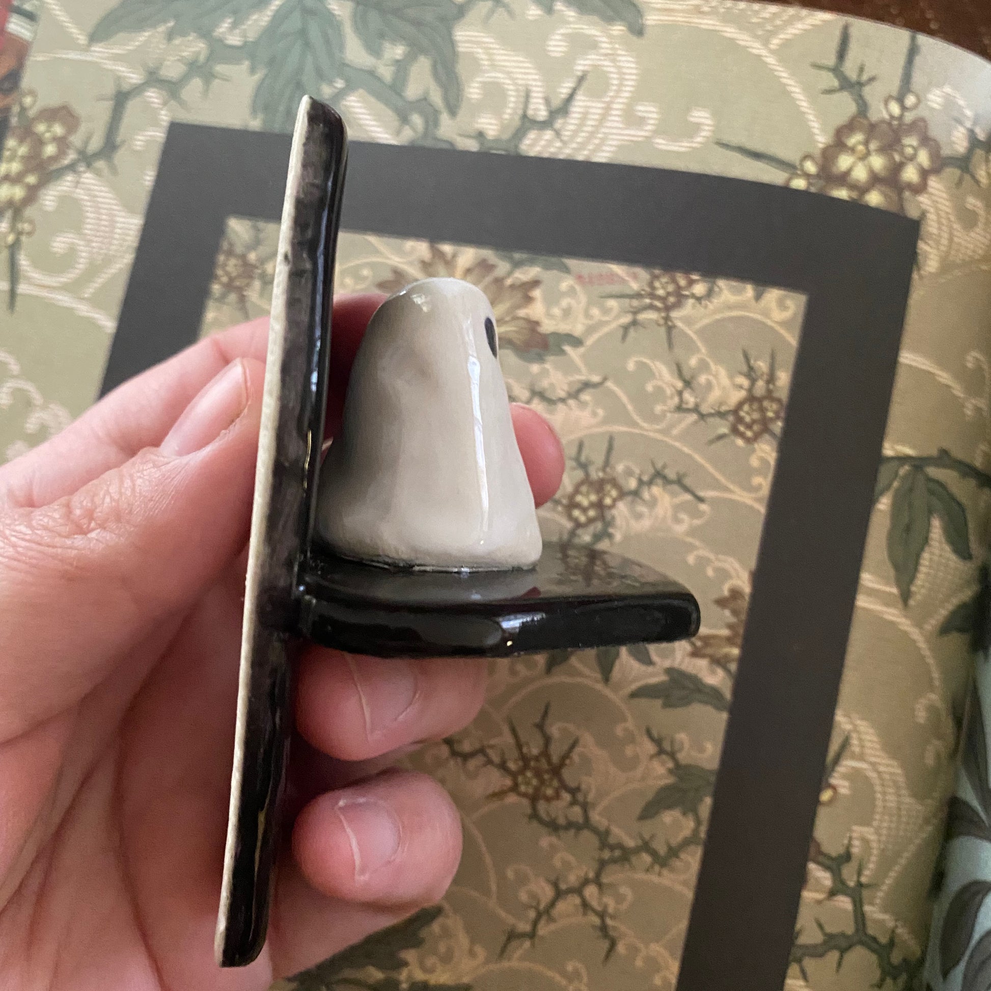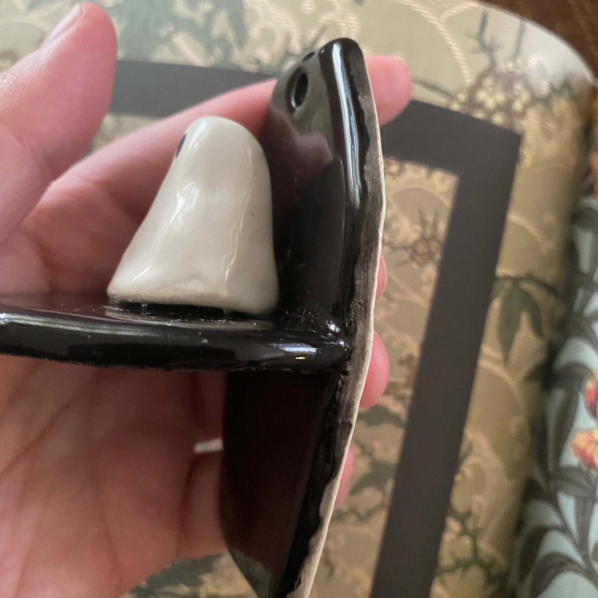 ✦ Decorated with black glossy glaze. Ghost is glazed with a glossy white and permanently attached to the shelf.
