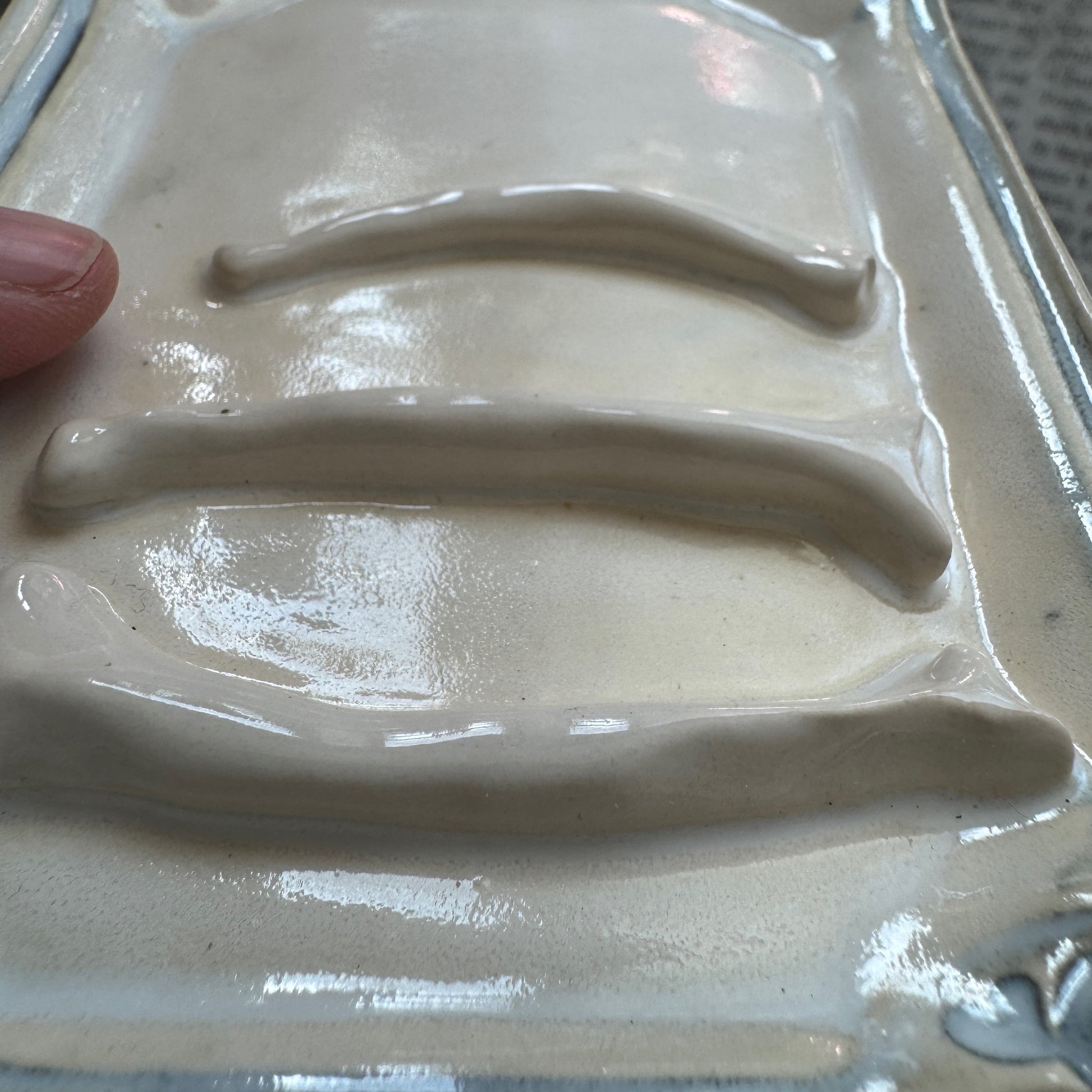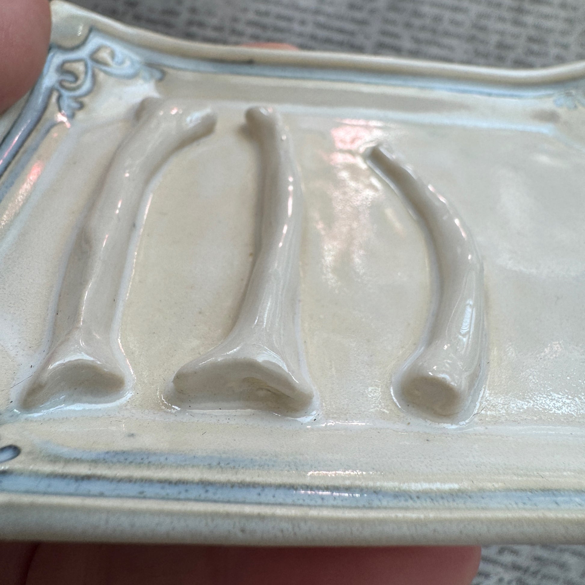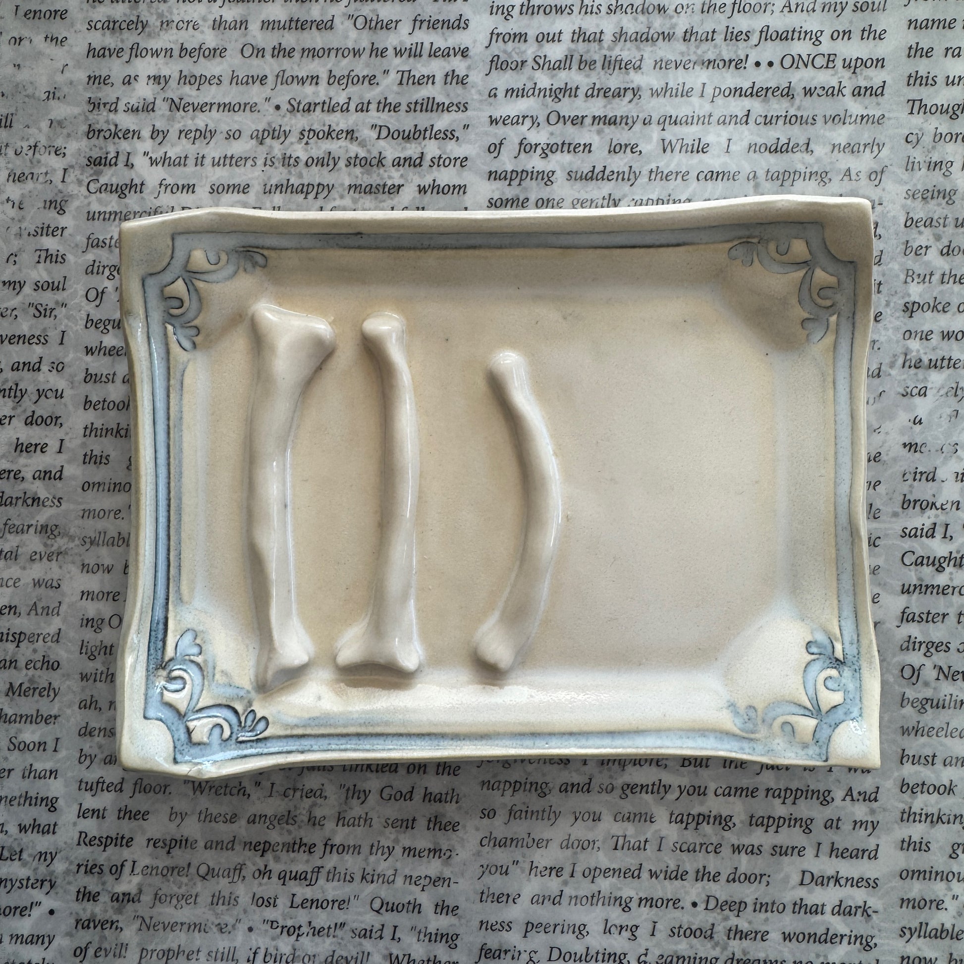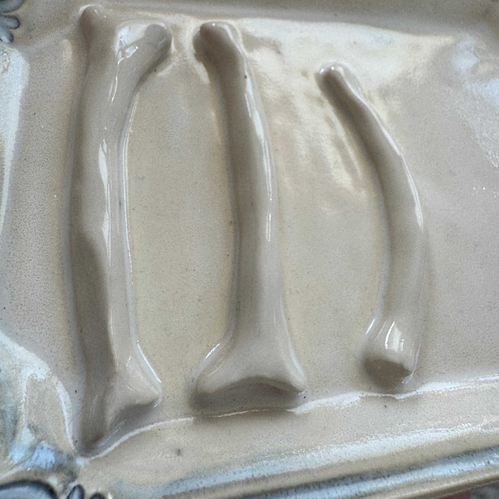 β¦ Tray is decorated with a a milky, opal white glaze with black accents and hand sculpted three dimensional bones