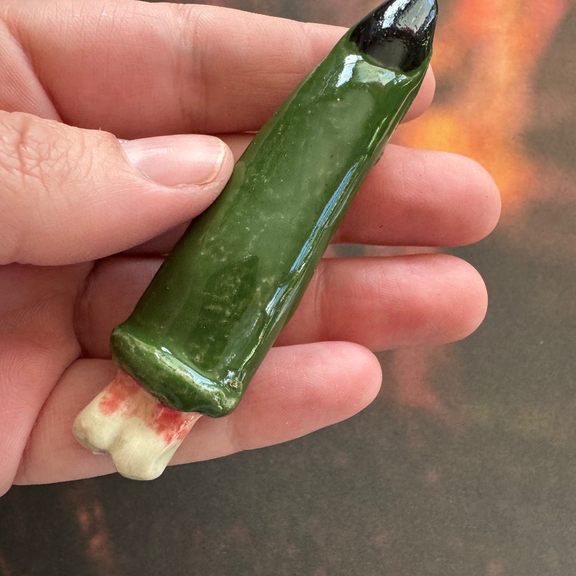 β¦ Finger is decorated with green and black glazes with red "blood" accent. Back of finger is unglazed
