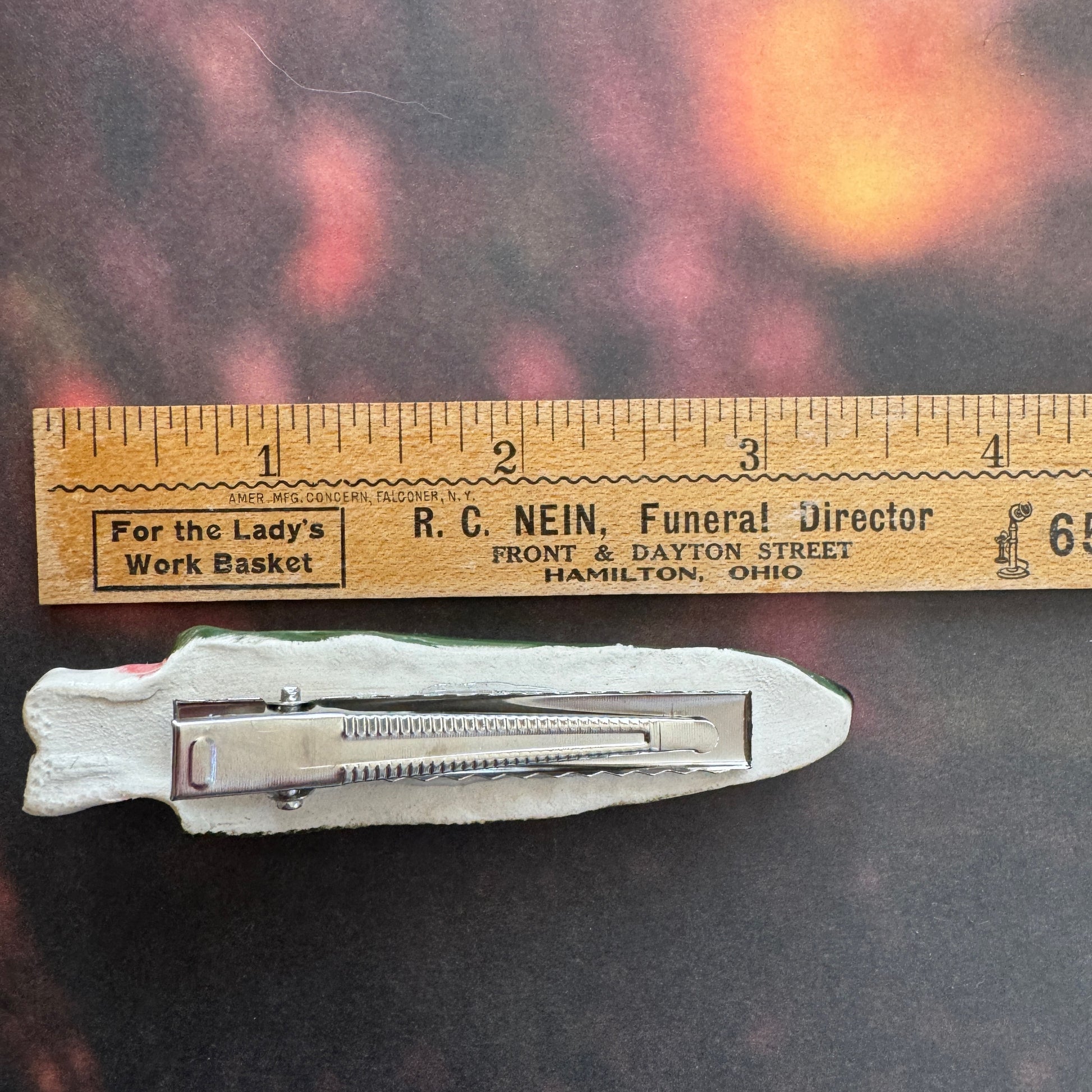 Our one-of-a-kind handmade ceramic green monster finger hair clip is perfect for adding a touch of quirky creepiness to any hairstyle!