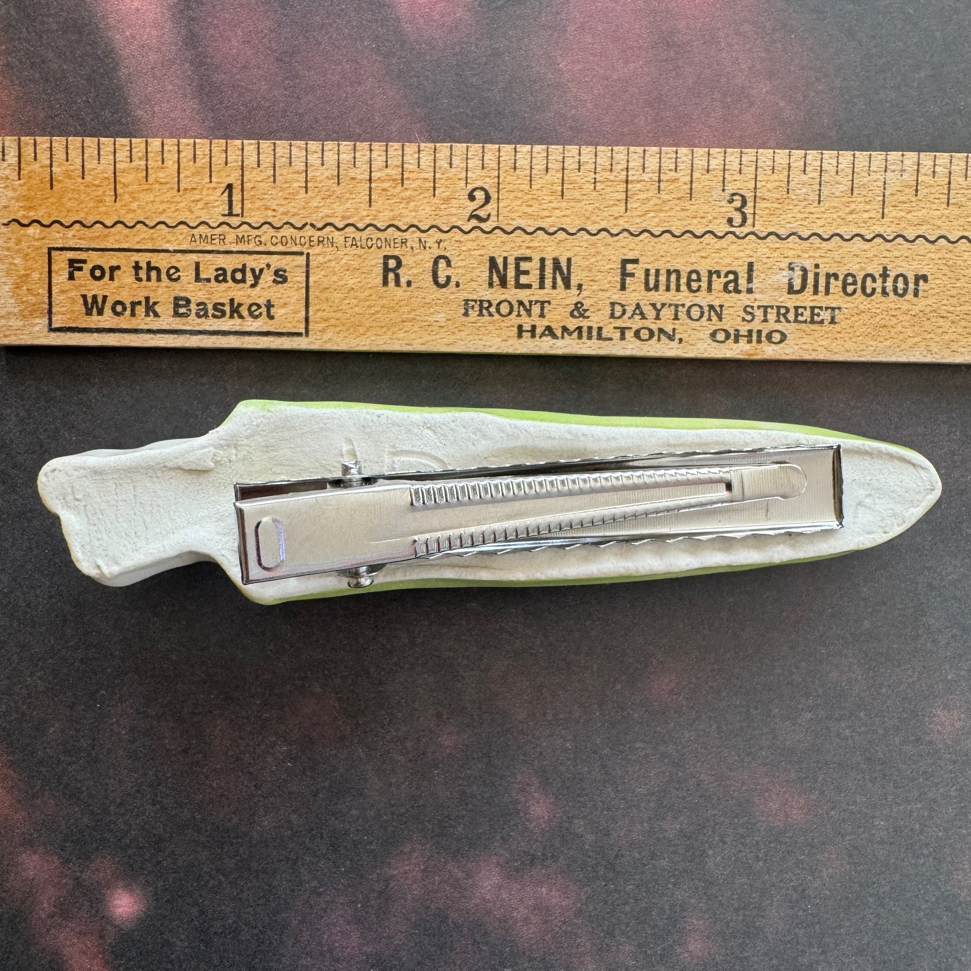 Our one-of-a-kind handmade ceramic green witch finger hair clip is perfect for adding a touch of quirky, nostalgic creepiness to any hairstyle!