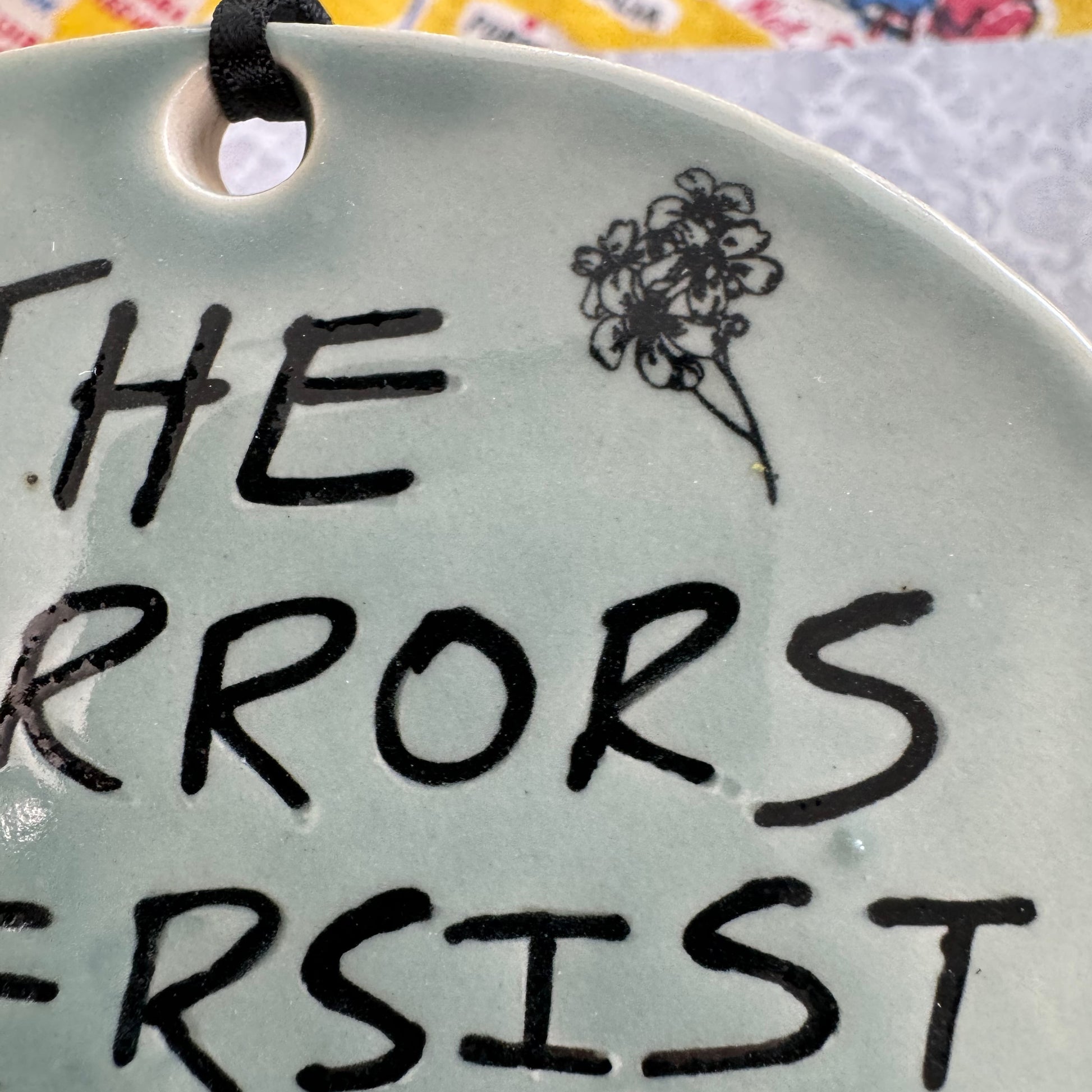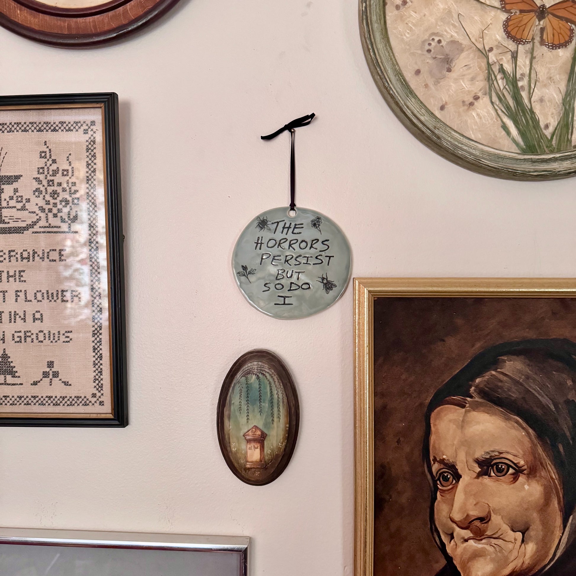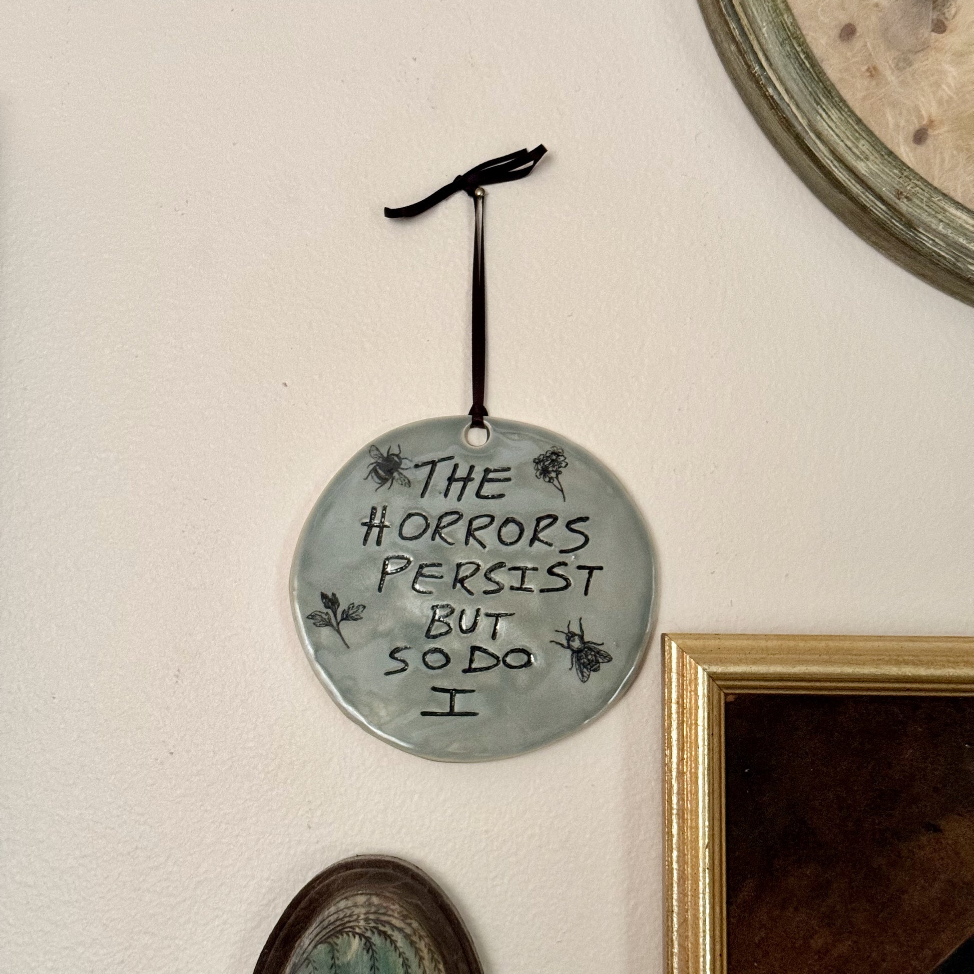 β¦ One handmade ceramic The Horrors Persist But So Do I wall hanging