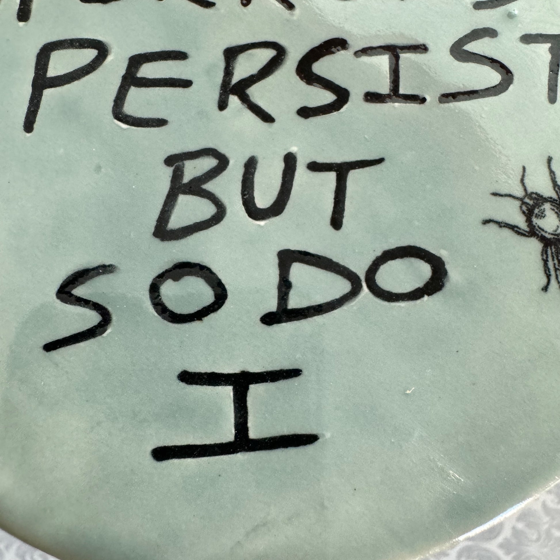 Defy the horrors and persevere with this handmade ceramic The Horrors Persist But So Do I wall hanging featuring a whimsical flower and insect design. Perfect for hanging in a bedroom, above an altar, or anywhere you need a little reminder of your own power.Β