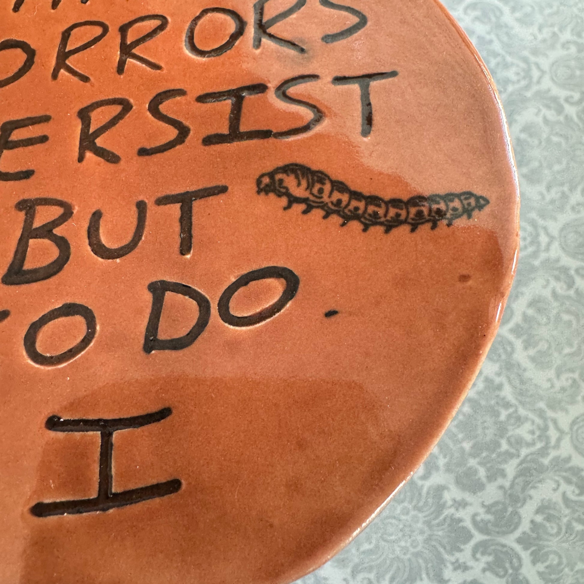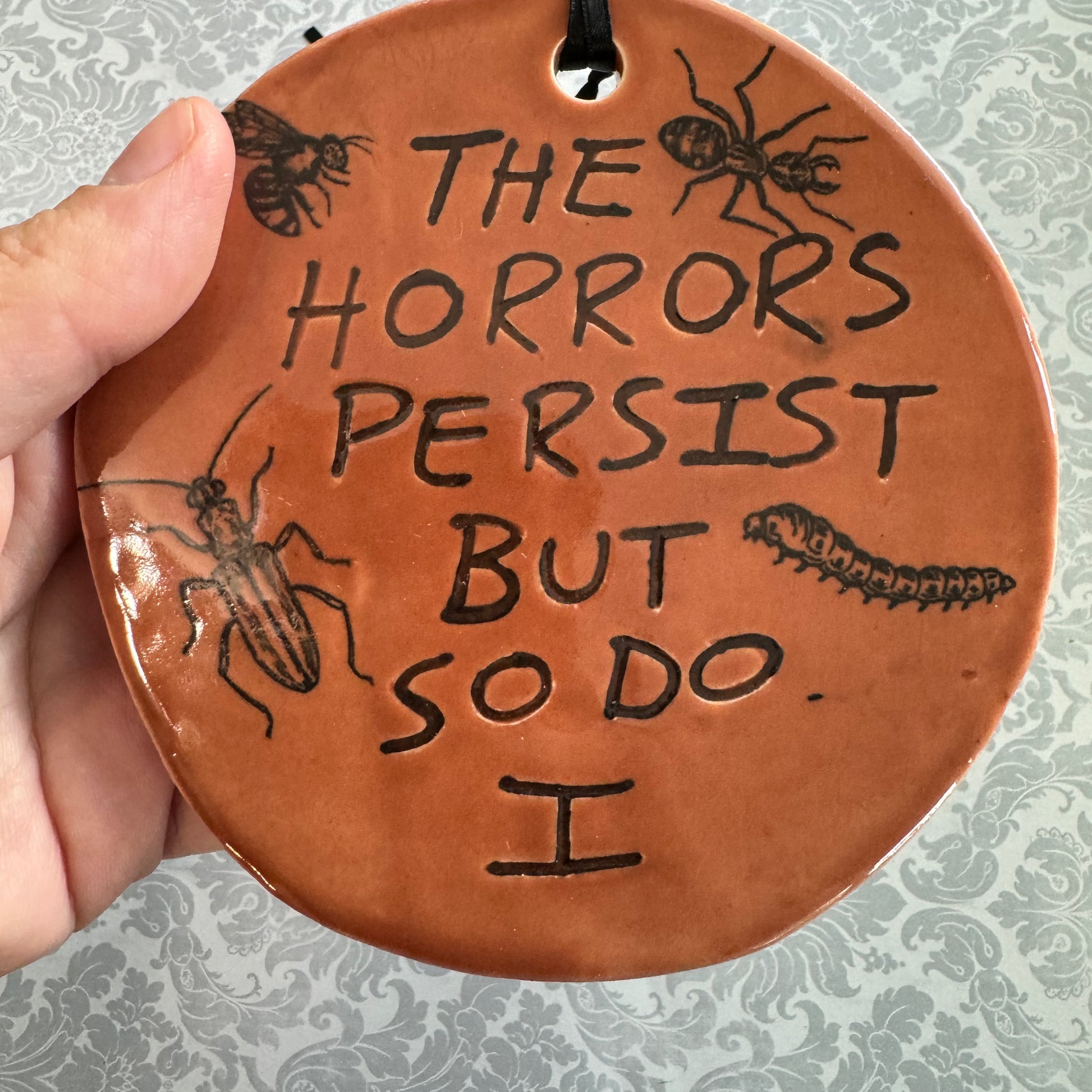 Defy the horrors and persevere with this handmade ceramic The Horrors Persist But So Do I wall hanging featuring a whimsical creepy crawlers design. Perfect for hanging in a bedroom, above an altar, or anywhere you need a little reminder of your own power.Β