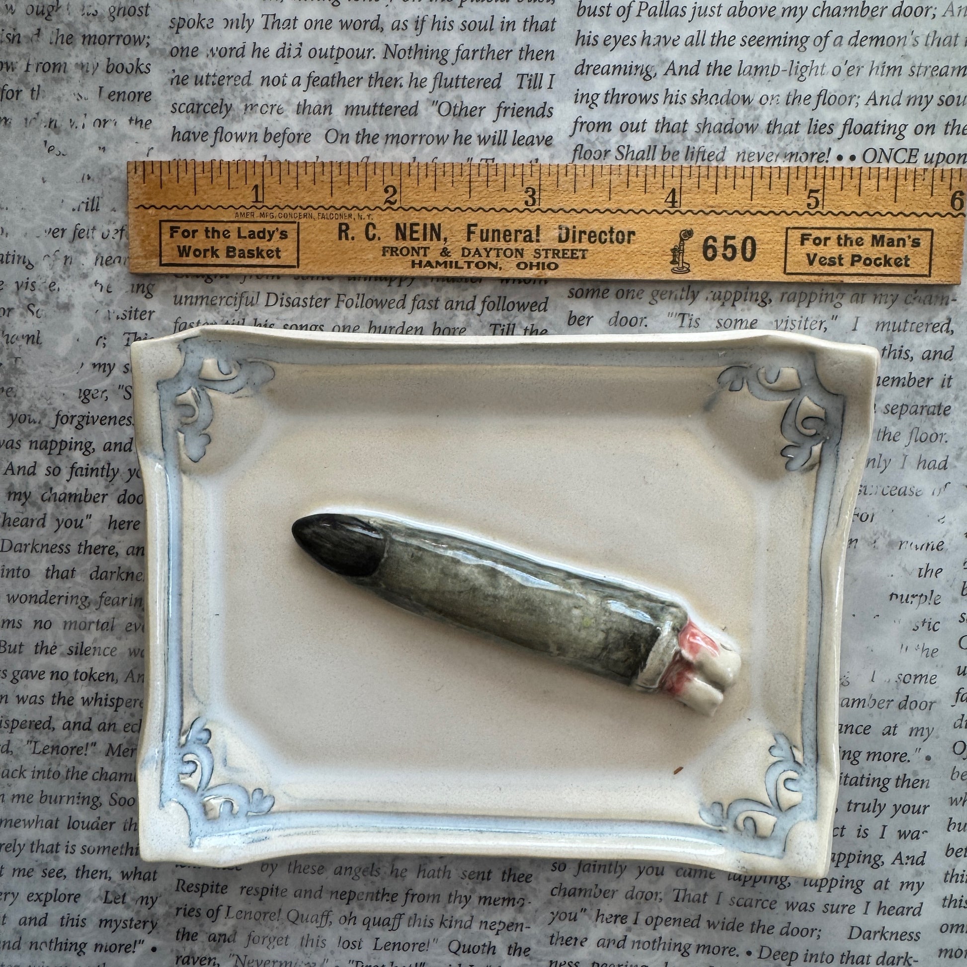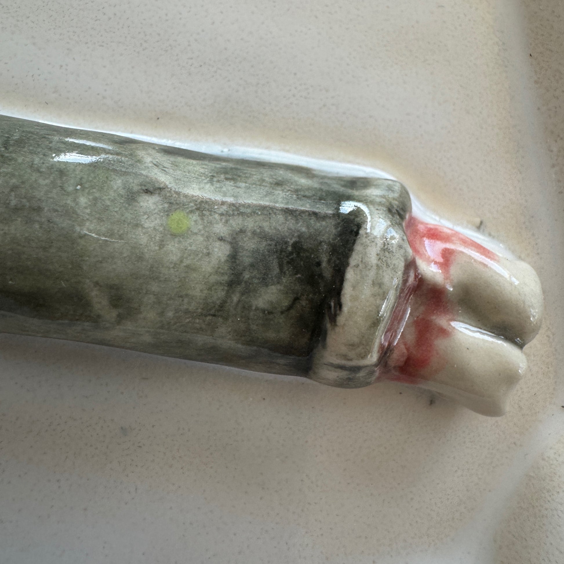 β¦ Tray is decorated with a a milky, opal white glaze with black accents and a glossy grey and black, sculpted three dimensional zombie finger