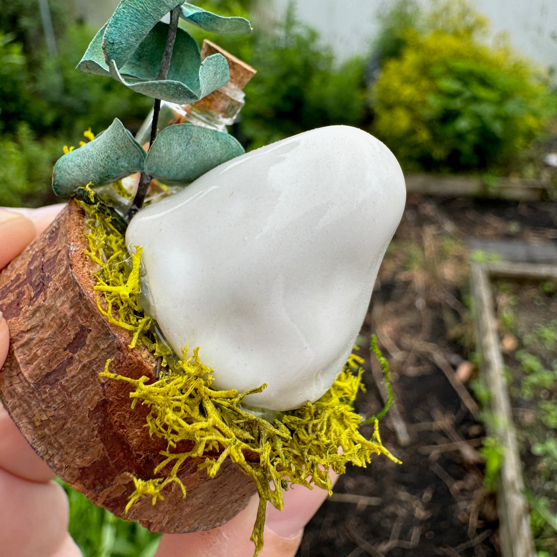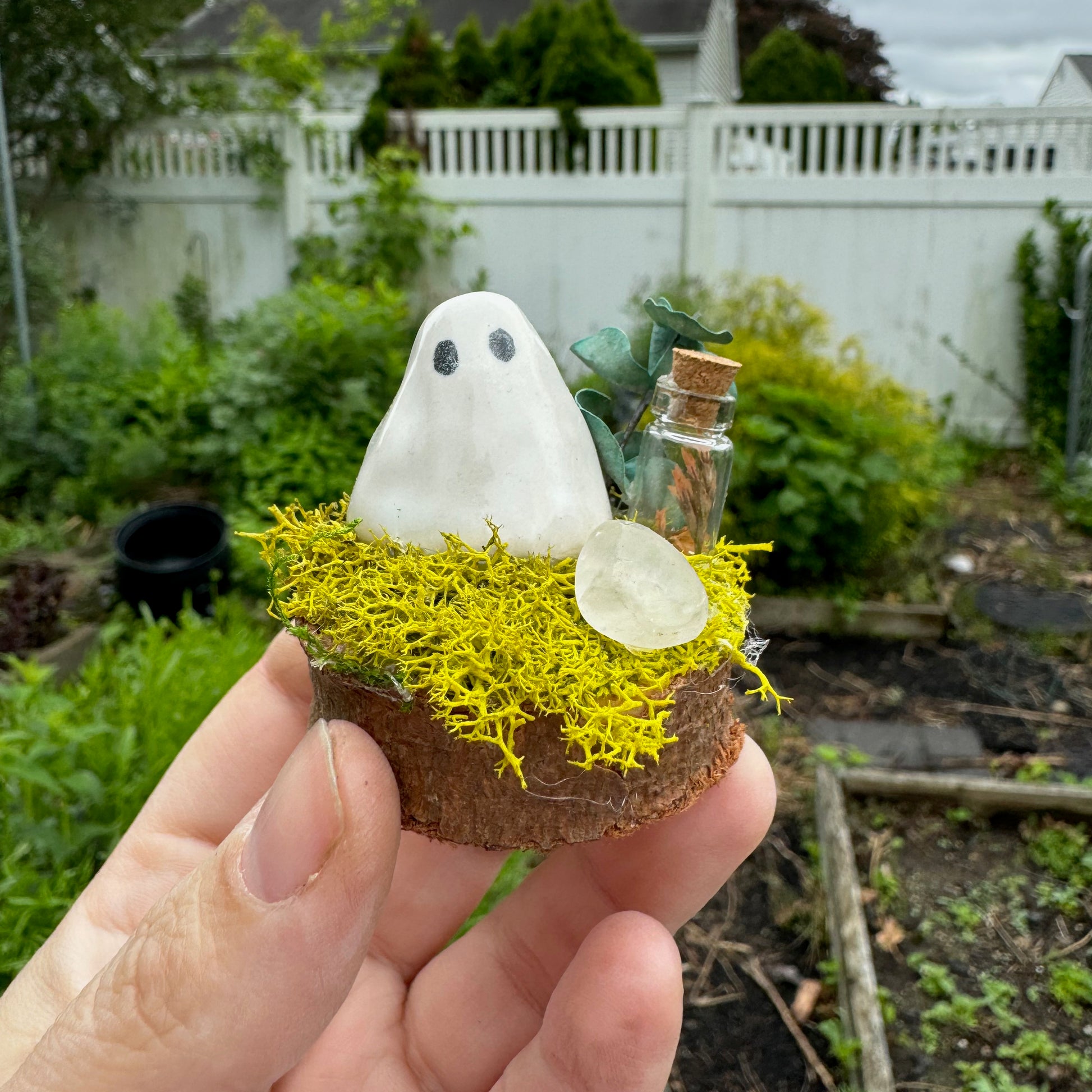 This exclusive, handcrafted Magic Potion Mini Ghost Garden features a mini ceramic ghost, preserved moss, dried flowers, crystal and a mini glass potion bottle on a wood slice base. Approximately 1.75" in diameter.