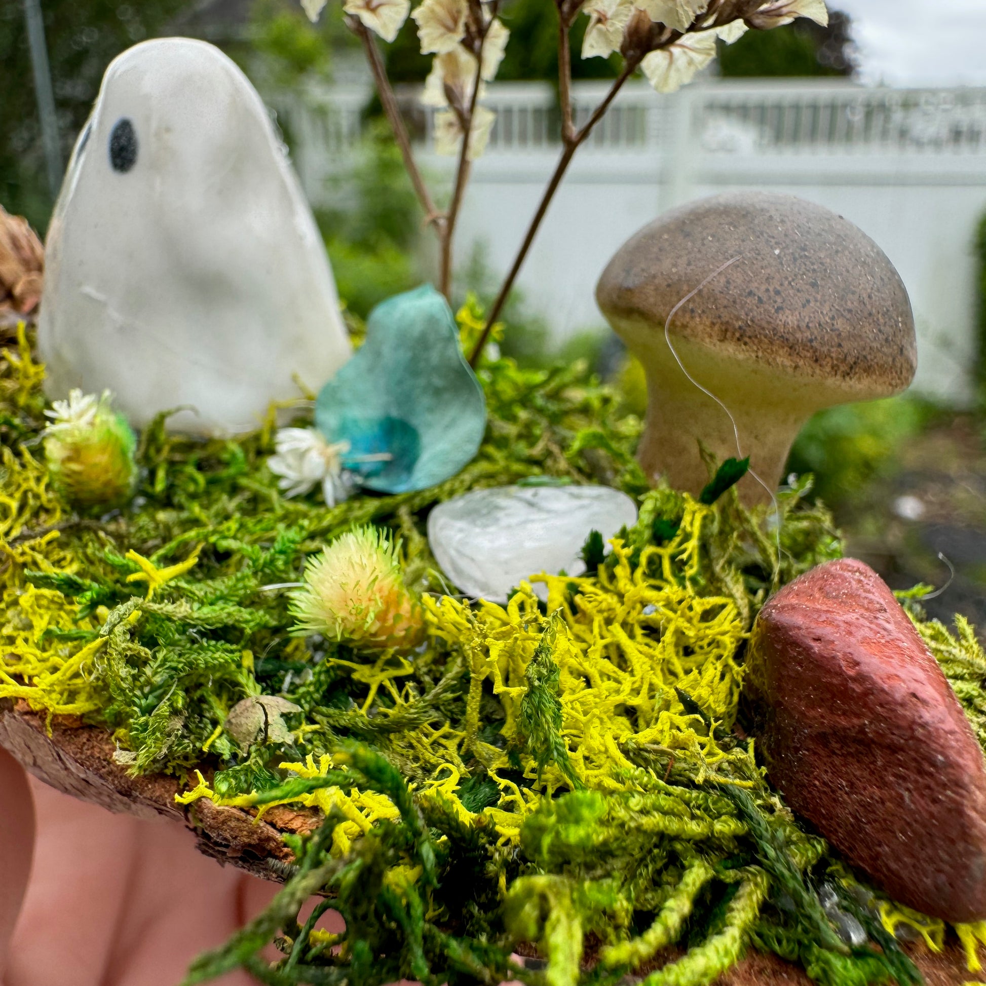This exclusive, handcrafted Mushroom Woods Ghost Garden features a mini ceramic ghost, preserved moss, dried flowers, crystals and a faux mushroom on a wood slice base. Approximately 5.5" long.