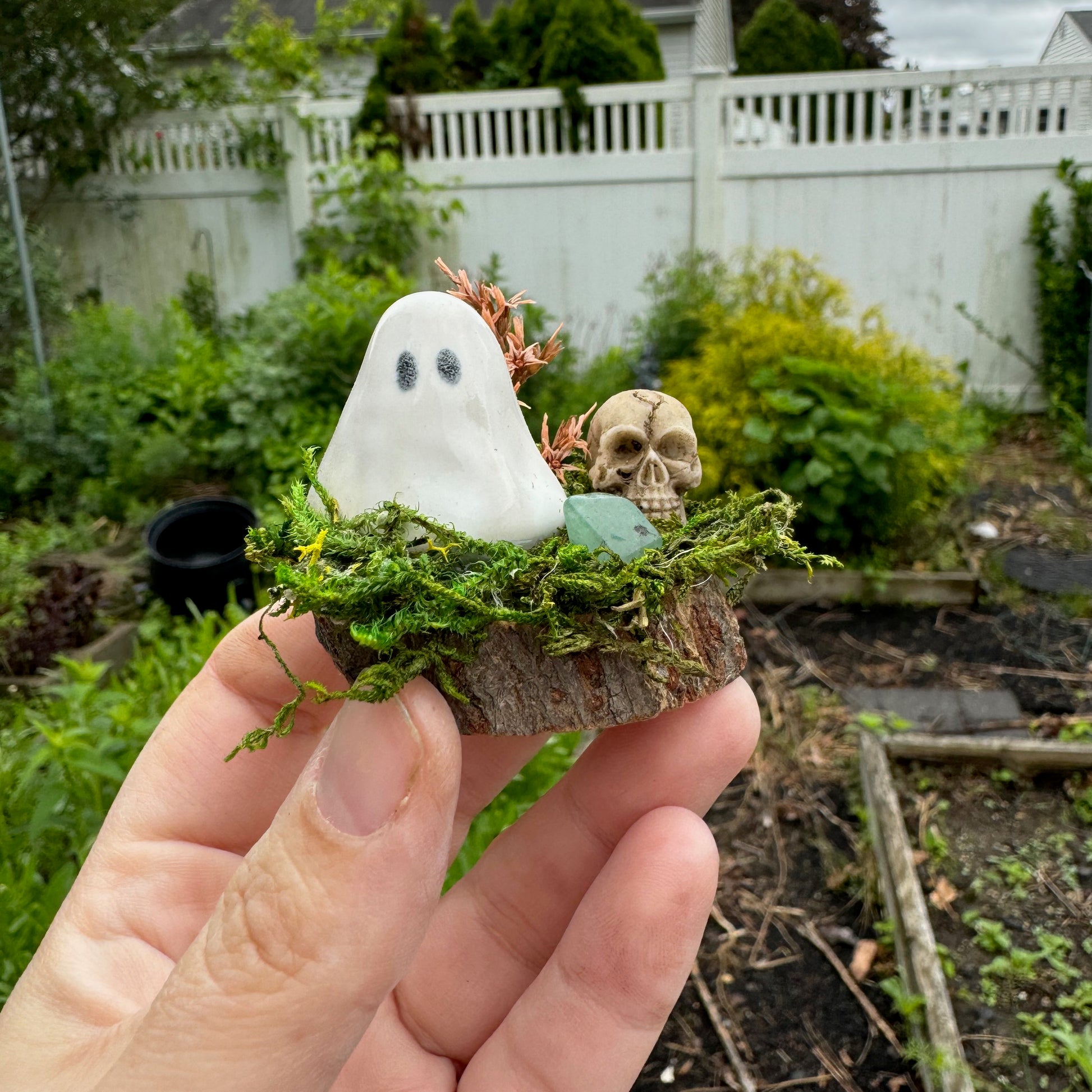 This exclusive, handcrafted Spooky Skull Mini Ghost Garden features a mini ceramic ghost, preserved moss, dried flowers, crystal and a faux skull on a wood slice base. Approximately 1.75" in diameter.