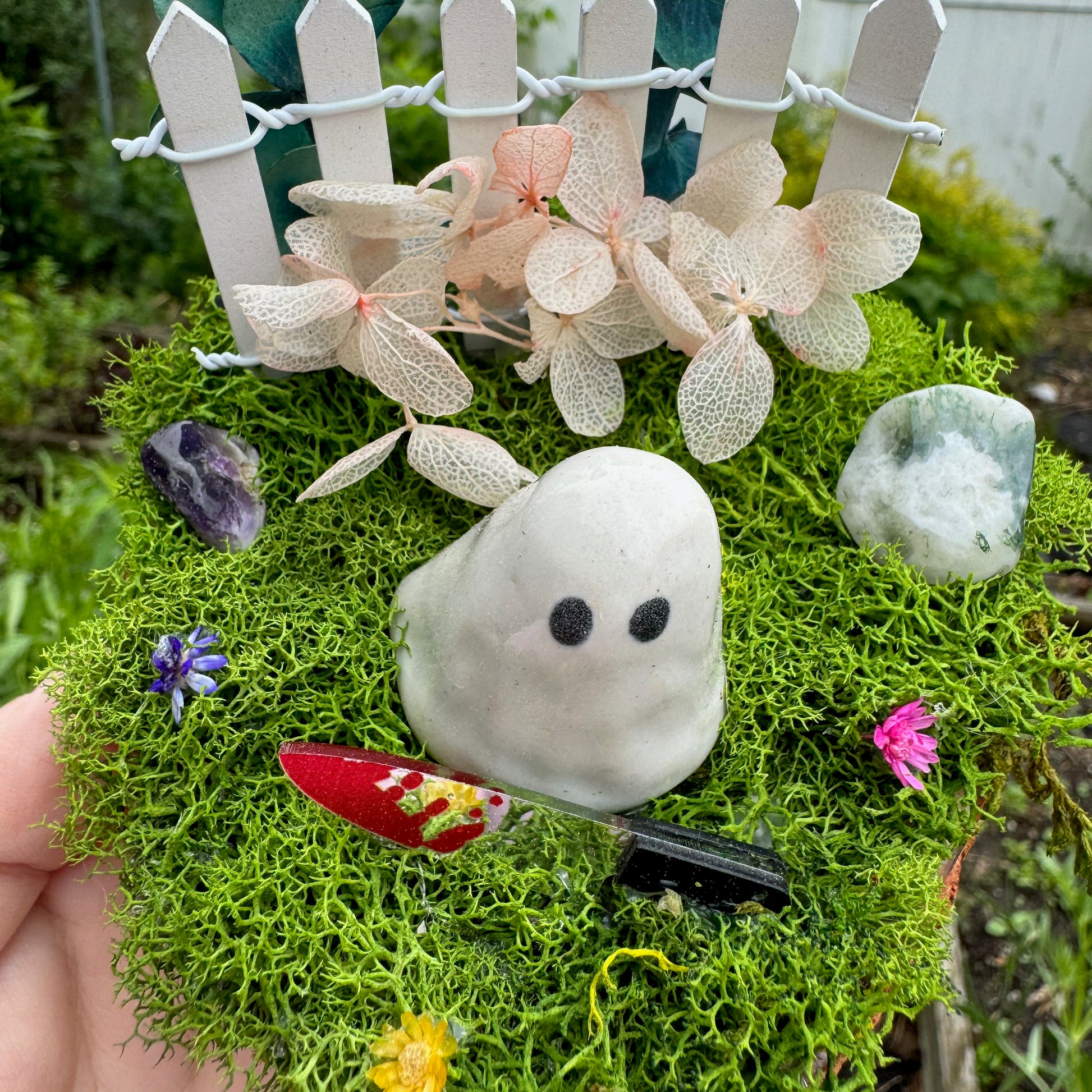 This exclusive, handcrafted The Murder Next Door Ghost Garden features a mini ceramic ghost, preserved moss, dried flowers, crystals and mini wood fence, faux bloody knife, and a mini lamp post on a wood slice base. Approximately 4.25" inches at widest point.